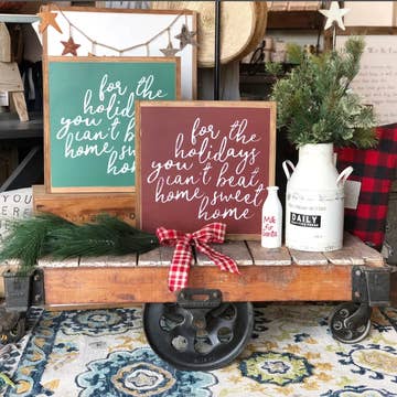 Panneau carré 20,3 x 22,9 cm Fond blanc cassé avec lettres noires. Chaque panneau est vieilli et possède un cadre teinté noyer foncé. Les panneaux peuvent être placés sur une étagère, mais ils sont livrés avec un seul support en dents de scie. Veuillez noter que chaque panneau est fabriqué à la main et que l'aspect vieilli peut varier. Il peut y avoir des bosses, des fissures ou des nœuds dans le bois qui ne sont pas considérés comme des défauts.
