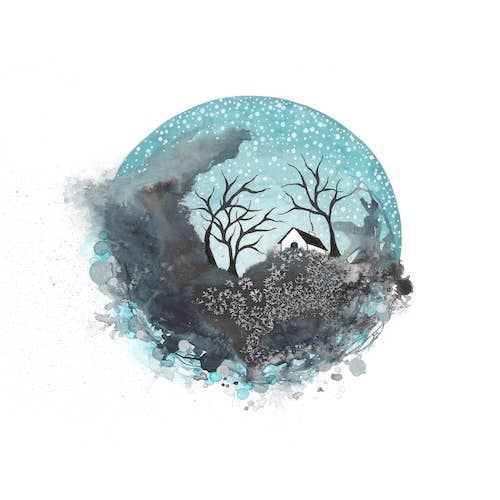 Carte de vœux 5x7 imprimée sur du papier cartonné 100 % recyclé post-consommation avec enveloppe kraft recyclée L'eau de votre corps a probablement été présente partout sur la planète à un moment ou à un autre de son histoire. Et le silence lent et constant d'une chute de neige dans les bois en janvier est l'endroit idéal pour réfléchir à de telles pensées de connexion. Voici l'image de janvier trouvée dans mon calendrier mural 2025 et elle représente un lièvre d'Amérique regardant à travers les branches de la forêt hivernale la neige qui tombe d'un ciel gris. Bien qu'il fonctionne comme une image autonome, chaque dessin de cette collection a été créé pour raconter une partie de l'histoire de la façon dont l'eau de notre planète nous relie tous. Cette œuvre intègre des phrases cachées telles que « une rencontre avec le temps profond », « l'importance des forêts anciennes » et « trouvez le plus grand arbre ».