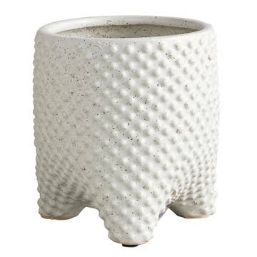 Livré avec des trous de drainage et une plaque de drainage assortie Mini mesure environ 2,5 pouces de hauteur par 2,5 pouces de diamètre La taille moyenne mesure environ 3,25 pouces de hauteur par 4 pouces de diamètre Max mesure environ 5,5 pouces de hauteur par 5 pouces de diamètre Glaçure blanche mouchetée sur une base d'argile brune L'intérieur de la jardinière est vitré