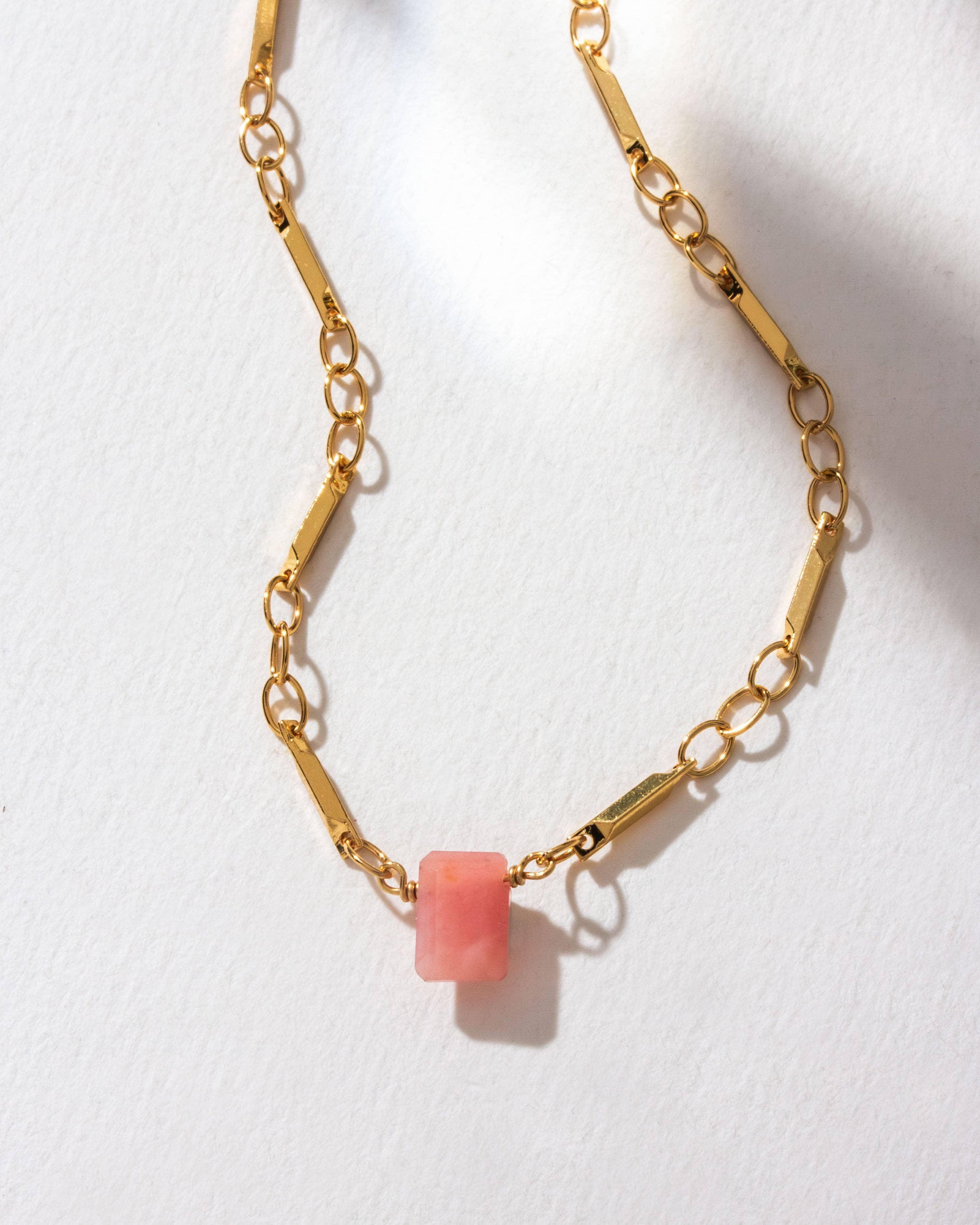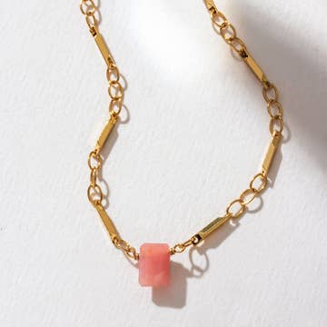 Un joli collier Rolo en or mat avec une perle en verre tchèque vert pâle et une perle en quartz rose suspendue. Les perles mesurent 6 mm à 2 mm. Le collier est ajustable et mesure 16 pouces avec une extension de 2 pouces. Les détails : Collier à chaîne en forme de trombone en or mat Longueur : 16 pouces avec extension de 2 pouces Fermoir mousqueton Perles de 2 mm à 6 mm Quartz rose Fabriqué à la main dans notre studio de Burlington VT