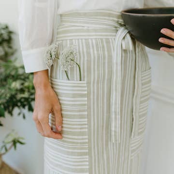 Simple mais élégant, ce demi-tablier vous accompagnera de la cuisine au jardin. La coupe taille haute vous permet de rester propre lorsque vous travaillez sur l'îlot de cuisine. Avec de longues bretelles pour un meilleur ajustement. H : 21 1/2 po/55 cm L : 86 cm 100 % lin Fait main à Montréal Lavable en machine jusqu'à 40 °C. Sécher par culbutage à basse température, suspendre ou étendre à plat pour sécher. Le repassage n'est pas nécessaire, mais si vous le souhaitez, vous pouvez repasser pendant que le tissu est encore humide.