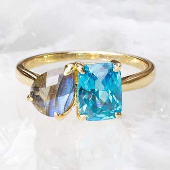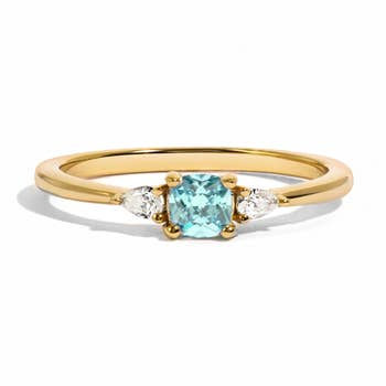 Pierre précieuse : Tourmaline Paraiba de laboratoire, 1 pièce, forme ronde, 8 mm, 2,5 carats. Pierres latérales : Diamant de laboratoire, 2 pièces, forme de cerf-volant, 4,4x2,4 mm, 0,3 carat au total. Métal : Or jaune ou or blanc massif 14K avec poinçon 14k, 3 grammes. Disponible en tailles 4 à 10, y compris les demi-tailles. Parfait comme bague de fiançailles, bague d'anniversaire, bague cocktail ou bague statement. Étanche, hypoallergénique, résistant au ternissement. Fabriqué aux États-Unis avec des pierres de laboratoire éthiques, chaque pièce est fabriquée à la main avec soin. Les demandes de conception personnalisée sont les bienvenues - parfait pour les boutiques offrant des bijoux fins personnalisés.