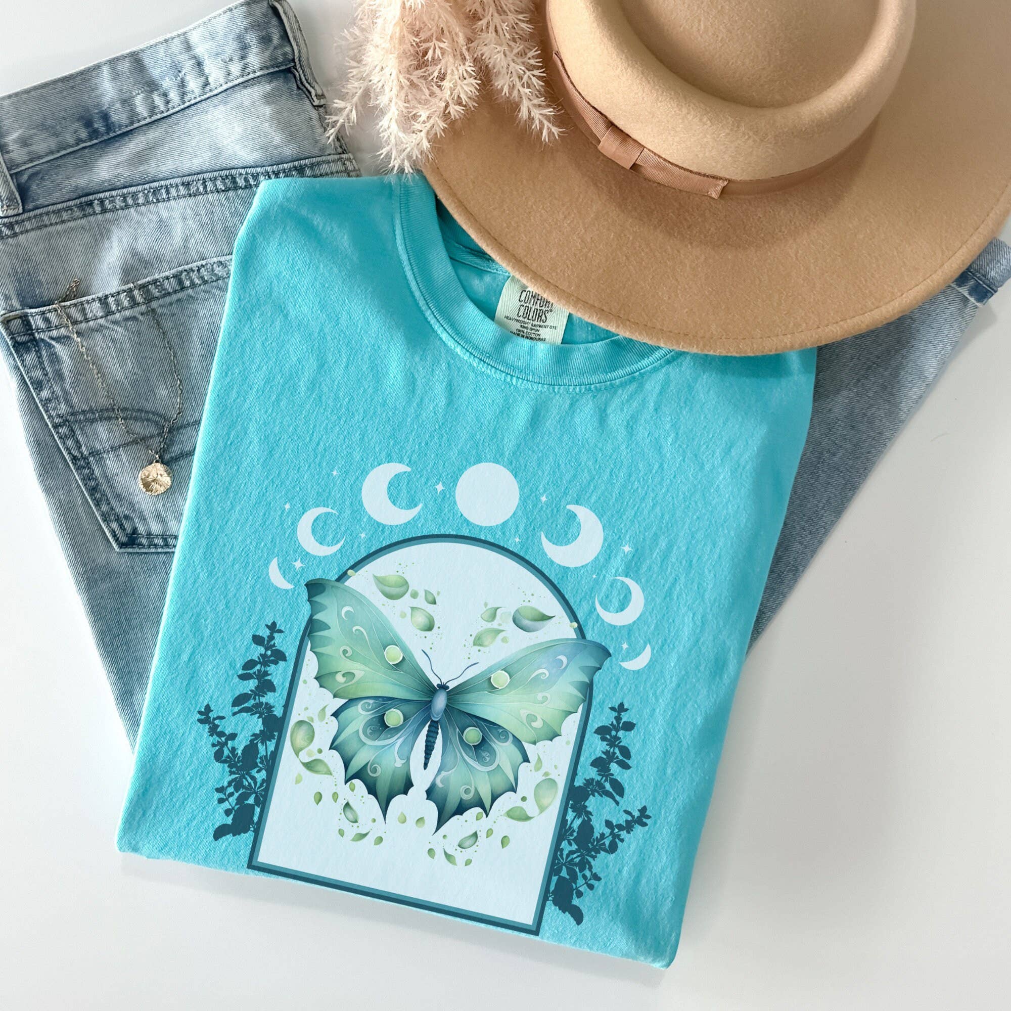 T-shirt à motif en forme de croissant décroissant, de fleurs sauvages et de papillons en vente B2B