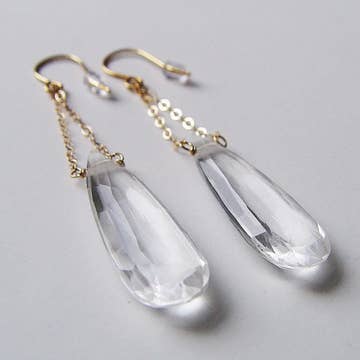 Le quartz à facettes est enveloppé d'un fil de remplissage en or 14 carats et suspendu à un cerceau en argent sterling. Câble d'oreille doré. La longueur totale est de 1,25 pouces. Également disponible en argent sterling, entièrement en or.