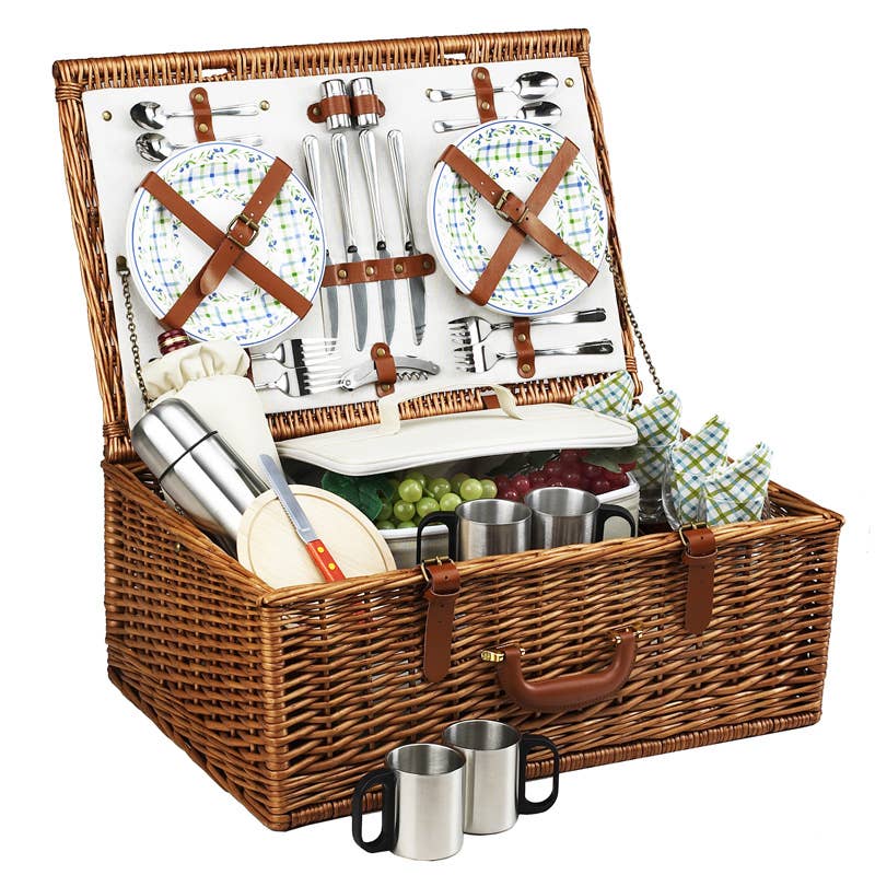 Le panier pique-nique Belmont pour 4 est un panier de pique-nic anglais de luxe rempli d'un service complet de vin et de fromage pour quatre personnes et d'un charme vintage romantique. Notre panier de pique-nic en osier de saule est doté d'une doublure durable, d'une section isotherme amovible, ainsi que d'un ensemble de pique-niques à vin avec quatre serviettes 100 % coton, ainsi que des assiettes et de l'argenterie pour 4 personnes solidement attachées au couvercle avec des sangles en cuir et 4 verres à vin maintenus en place dans le corps du panier avec un élastique. Et il y a encore beaucoup de place pour les plats chauds et froids, le vin, le fromage, la charcuterie et plus encore ! Avec tous les accessoires nécessaires pour un pique-nique parfait, le panier de pique-nic Belmont est un cadeau de mariage ou d'anniversaire élégant et pratique pour les couples et les familles aimants !