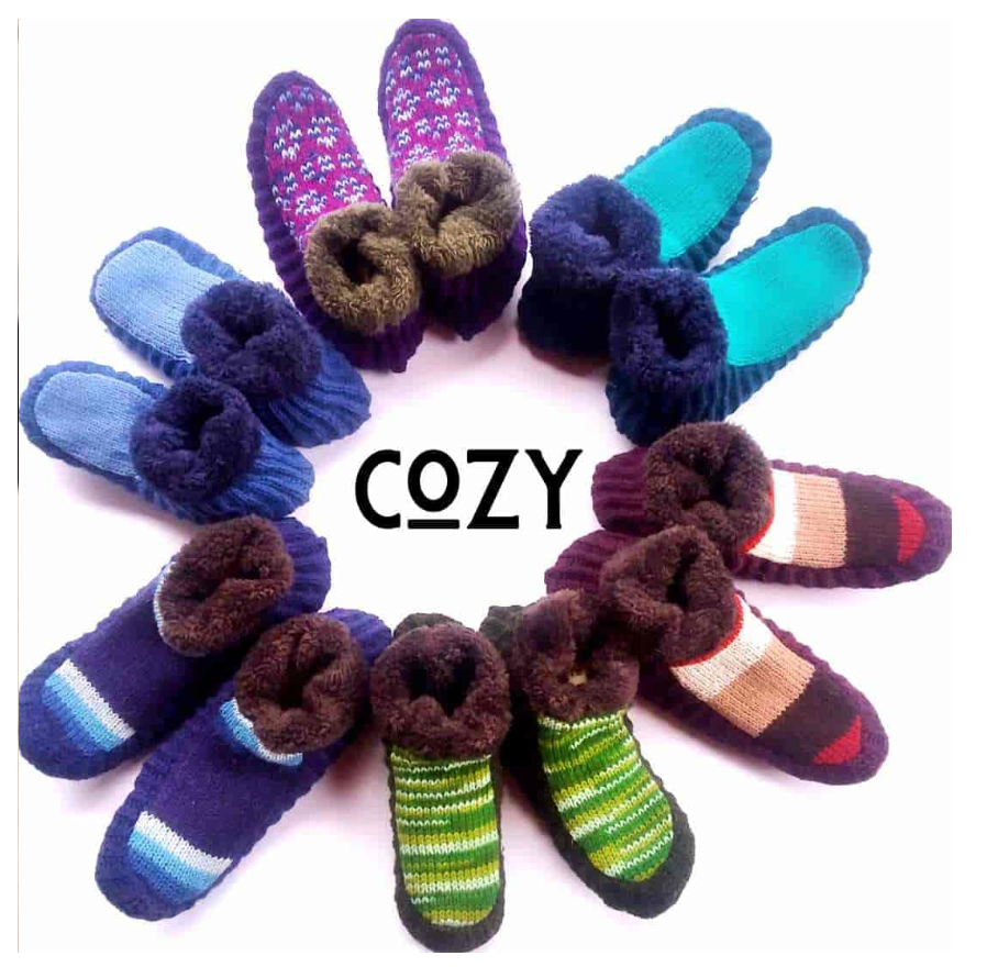 Chaussons bottines avec des motifs colorés, en laine tricotée avec doublure en polaire, taille adulte ou enfant, faits à la main au Népal Couleurs assorties SKU : ZZSL