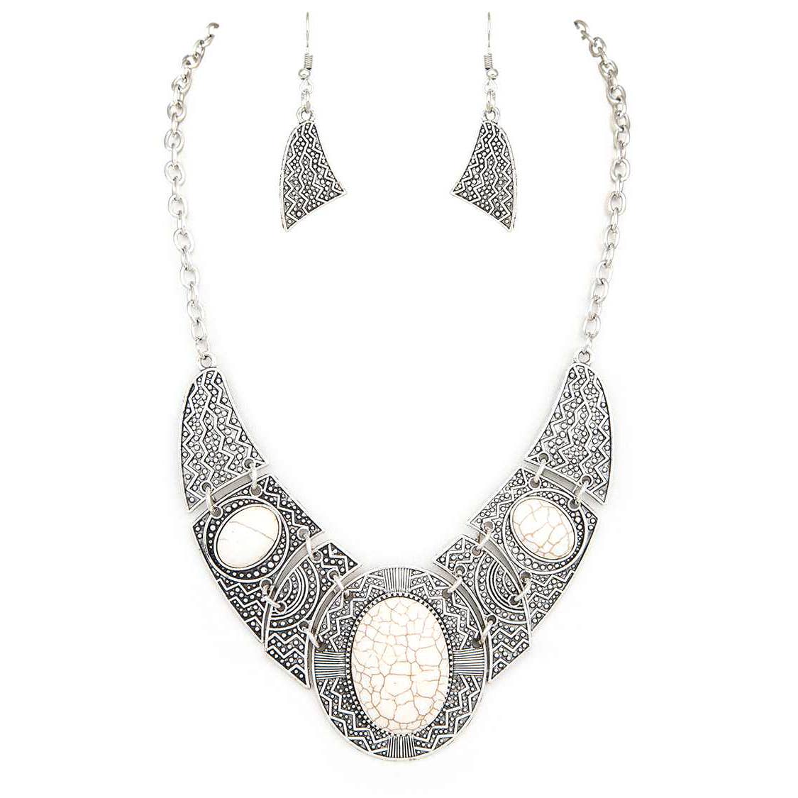 ► Parure pour femmes comprenant un collier, un bracelet, des boucles d’oreilles et une bague ajustable, tous plaqués argent, au design bohème unique. ► Matériaux : Laiton plaqué argent et zinc ► Parfait pour les fêtes d’Halloween et autres festivals Dimensions : - Collier : longueur 56,1 cm (22,10") / pendentif : largeur 6,6 cm (2,6"), longueur 21,8 cm (8,6") - Bague ajustable : longueur 3,7 cm (1,45"), largeur 3,7 cm (1,45") - Boucles d’oreilles : longueur 3,7 cm (1,45"), largeur 3,7 cm (1,45") - Bracelet : longueur 16,4 cm (6,45"), largeur 5,5 cm (2,15") ► Bijoux en argent vieilli au style antique ► Fabriqué à la main selon des techniques ethniques naturelles ► Idéal comme cadeau de mode pour femmes ► Hypoallergénique ► Sans plomb, nickel ni cadmium.