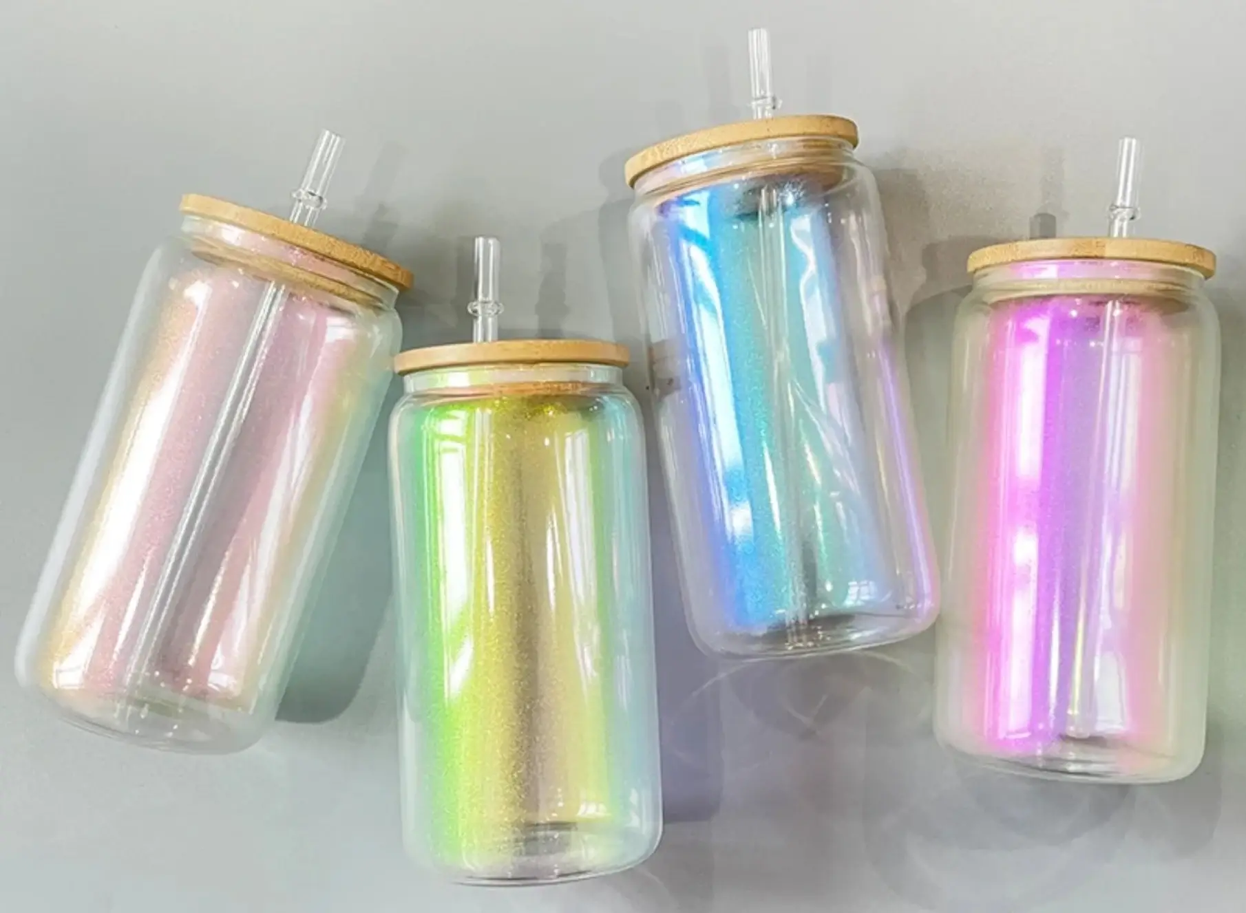 Gobelets en verre à paille canette à sublimation de 473 ml avec effet scintillant. Lot de 50 pièces - 8 par couleur + 10 rose vif. Comprend un couvercle en bambou et une paille. Convient pour la personnalisation par vinyle, sublimation ou utilisation en globe à neige. Contenance : 16 onces fluides (473 ml).