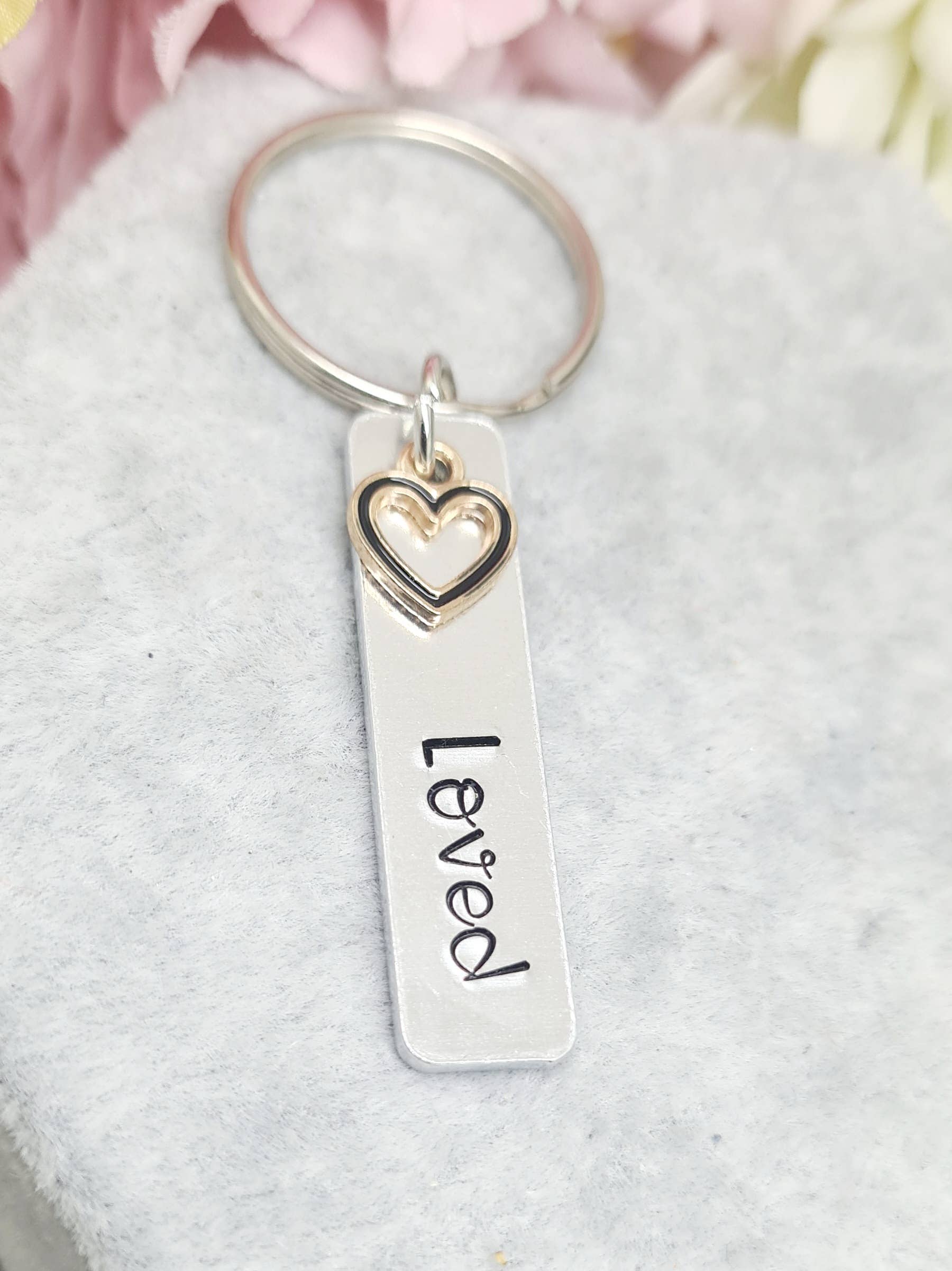 Porte-clés estampé à la main avec inscription : Belle Avec une breloque marguerite. Matériau : aluminium (léger, ne ternit pas, hypoallergénique)
