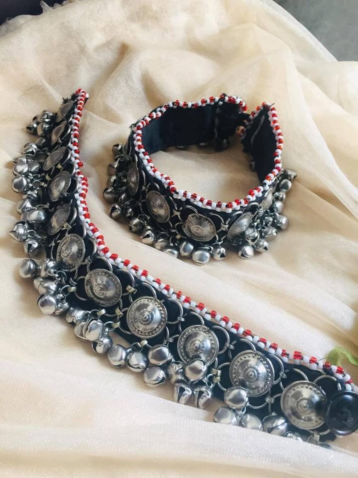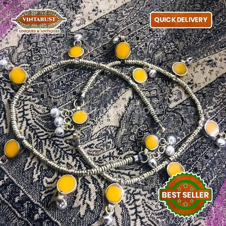 • Ces bracelets de cheville tribaux argentés élégants et fantastiques sont l'une des pièces les plus admirées de notre collection. Les détails et le motif de ces bracelets de cheville tribaux sont exceptionnels. De minuscules clochettes rythmiques argentées sont bordées sur l'ensemble de ces bracelets de cheville. À chaque mouvement, ils sonnent doucement. Le design finement tissé de ces bracelets de cheville est exceptionnel. • L'alliage métallique de la meilleure qualité est utilisé lors de la fabrication de ce chef-d'œuvre. Ces séduisants bracelets de cheville tribaux sont légers et faciles à porter. La façon dont ces bracelets s'adaptent à votre cheville est tellement satisfaisante. Des artisans talentueux d'Asie du Sud ont travaillé à la fabrication de cette incroyable pièce tribale. La qualité antique de la serrure est utilisée pour porter cette pièce artistique. • Ces bracelets de cheville tribaux sont parfaits pour les occasions traditionnelles telles que les mariages, les fiançailles, les réunions de famille, etc. Vous pouvez assortir ces boucles d'oreilles tribales alléchantes avec n'importe quelle couleur, n'importe quel style et elles vous donneront un look parfait.