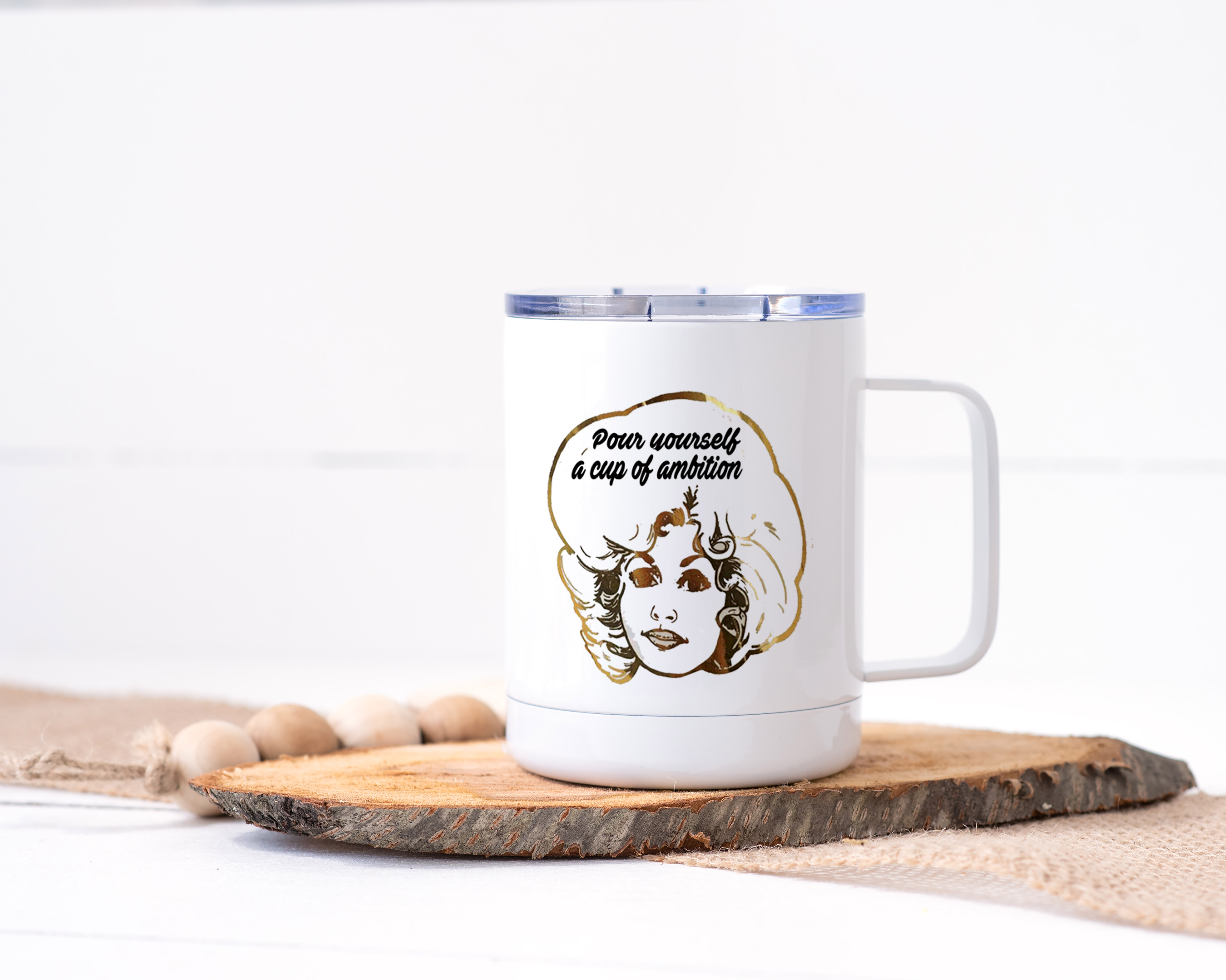 Dolly Parton Mug de voyage en acier inoxydable avec couvercle caféine caféine caféine Dites-le chanter à l'air de Jolene. Le cadeau parfait pour tout fan de Dolly ! 10oz. Acier inoxydable - Blanc - 4.25" H x 3.5" W. Passe au lave-vaisselle.
