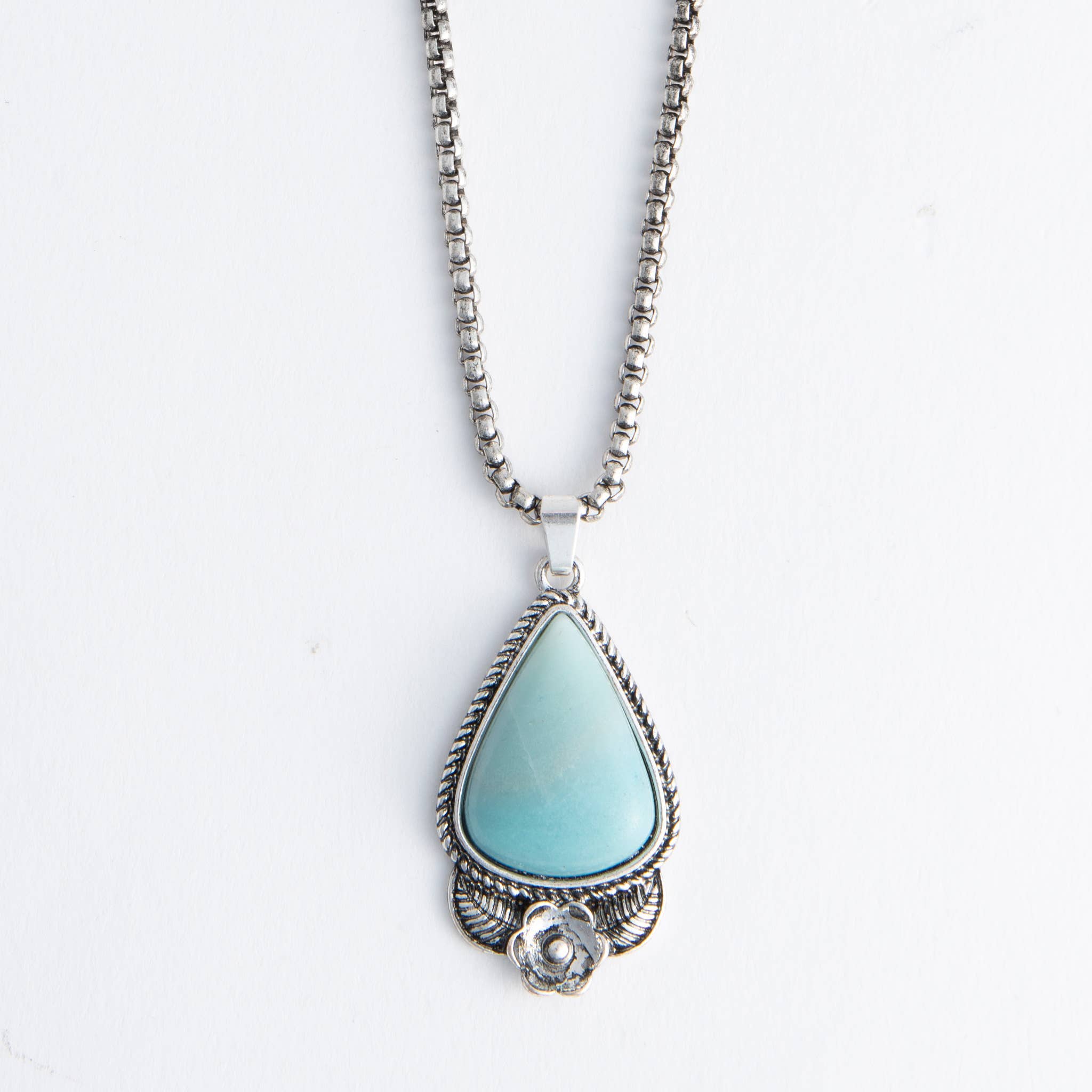 Canalisez le charme vintage et la beauté céleste avec le collier pendentif Asteria. Doté d'une pierre bleue en forme de goutte d'eau sertie dans un cadre carré en argent orné, ce collier de 18 pouces ajoute une touche d'élégance antique à n'importe quel look. Les détails en filigrane complexes et le design en maillons de chaîne en font une pièce remarquable avec un attrait intemporel, parfaite pour rehausser votre style quotidien ou pour superposer avec d'autres favoris.
