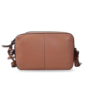Sac à bandoulière triple fermeture éclair en cuir lisse. Sangle réglable. Doublure anti-RFID. Deux poches avant zippées. Poche arrière ouverte. Poches intérieures zippées et glissière. Dimensions : 10,5 x 8,25 x 1,25 po