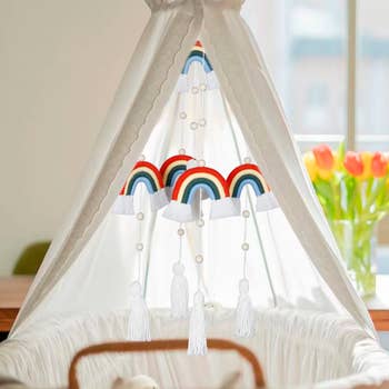<p>Mobile décoratif suspendu, comprenant une collection d'éléments en bois colorés : trois arcs-en-ciel, en bleu sarcelle, rose et orange, ainsi que des oiseaux, des fleurs, des nuages et un soleil. Une décoration douce et charmante pour la chambre d'un enfant.</p> <ul> <li>Mesure environ 28 cm × 30 cm (hauteur du bas jusqu'au sommet de l'arc-en-ciel le plus haut), une fois suspendu</li></ul> <p>Emballage :</p> <ul> <li>Boîte en carton imprimé</li></ul>