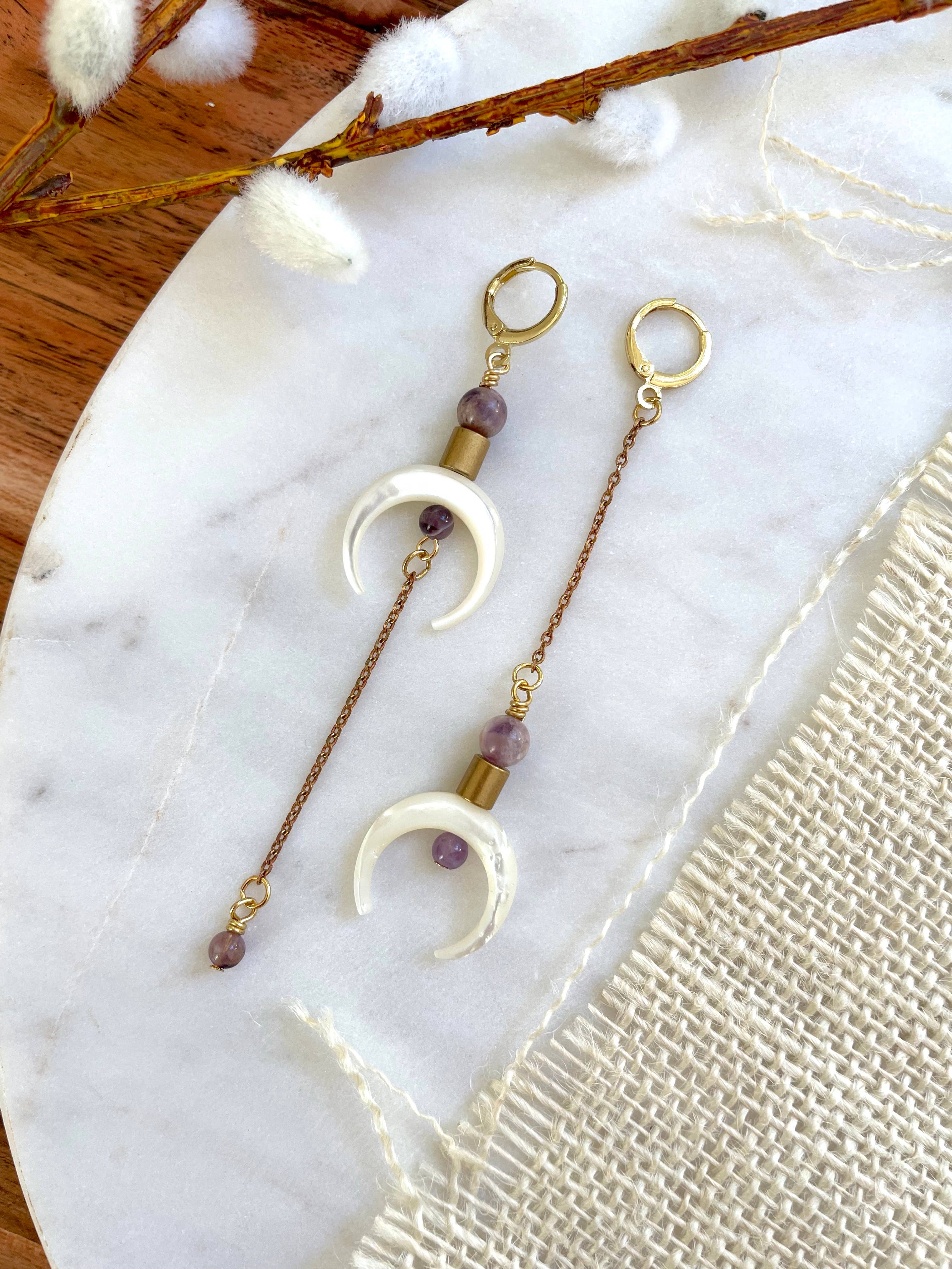 Ces boucles d'oreilles sont uniques, perlées, géométriques étoiles et lune avec des breloques de lune pavées plaqué or 18 carats, des perles amazonite mate, une turquoise africaine et des connecteurs étoiles en laiton brut. Ces boucles d'oreilles pendent environ 3,5" pouces du lobe. Les crochets d'oreille sont sans nickel et sans plomb et doivent être adaptés si vous avez une allergie au métal ou une sensibilité. Ces boucles d'oreilles sont très légères et faciles à porter toute la journée.
