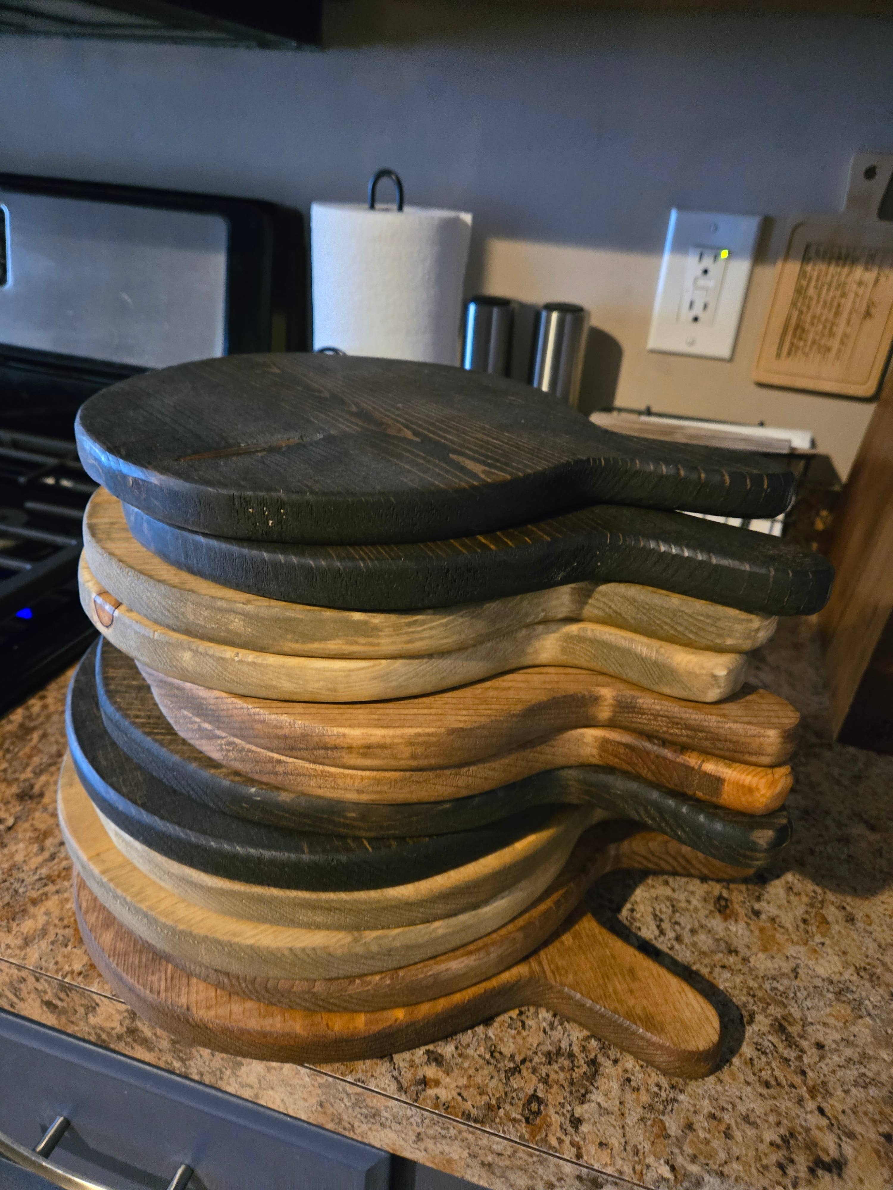 Ces petites planches à découper sont un excellent ajout à tout espace de la maison ou de l'entreprise. Fabriquées à la main en pin du Minnesota scié localement avec poignée. Toutes sont scellées avec une huile de qualité alimentaire. Disponibles en 3 tailles : petit 7" de diamètre plus 3" de poignée moyen 9" de diamètre plus 3" de poignée grand 11" de diamètre plus 3" de poignée Disponibles en 5 couleurs différentes : Mocha (le plus foncé), noyer (brun foncé), toast (brun avec des nuances de gris), gris, naturel (brut et non teinté) plateau de service, décoration de table, accent de maison, planche à découper,