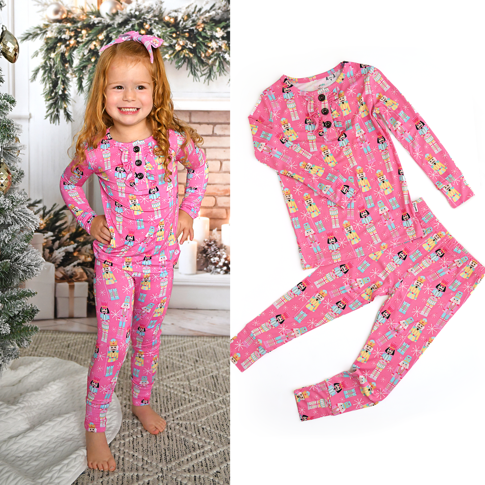 Ensemble de pyjama à manches longues SoftSnooze™ pour filles bambin en viscose de bambou Rosy Ribbons avec volants arrière signature en vente B2B