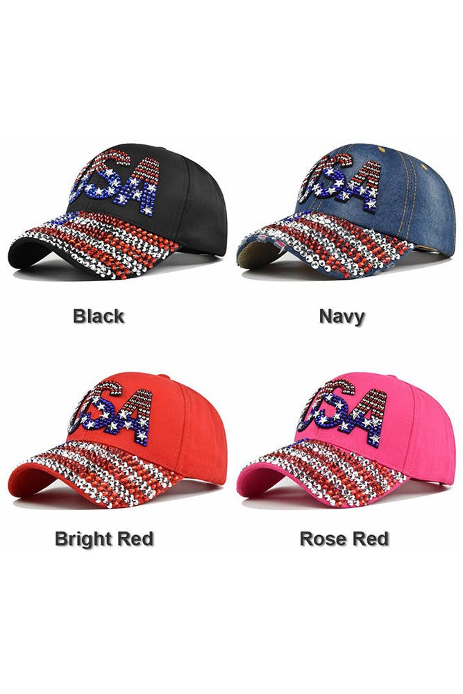 Casquette de baseball ornée de strass avec drapeau américain des États-Unis • Circonférence de la couronne : 23" (réglable) • Hauteur de la couronne : 4,5" • Hauteur de la visière : 3,25" • Matériau : 100 % coton