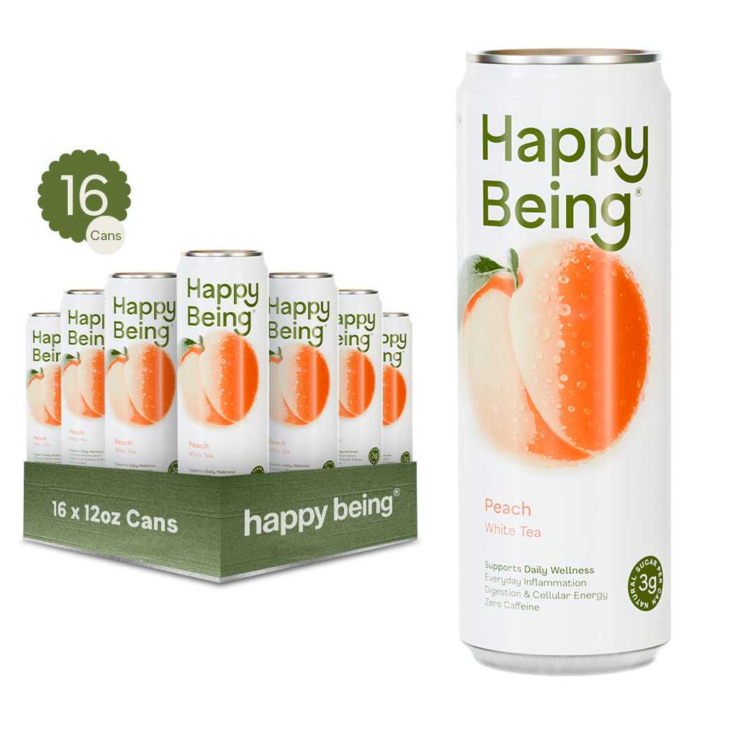 Thé blanc biologique infusé avec du jus de pêche mûre, offrant un mélange subtil de notes florales et fruitées. Aide à réduire l'inflammation, soutient la digestion et procure une énergie naturelle et agréable. Seulement 20 calories et 3 grammes de sucre, Happy Being est sans culpabilité et délicieux.