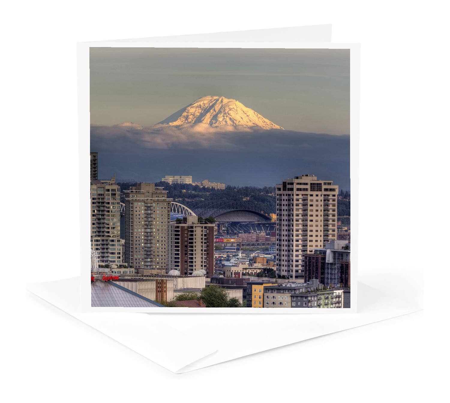 Carte « Greetings From Seattle ». Illustration originale, imprimée numériquement. Chaque carte est imprimée en couleurs riches, ce qui donne un effet de couleur amusant et percutant ! Papier blanc mat 100 lb, plié Ils ont l'air bien et se sentent bien ! 4,25 x 5,5 format A2 Comprend une enveloppe blanche et une pochette transparente Ces designs de cartes apporteront de la joie dans votre boutique !