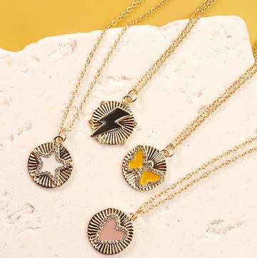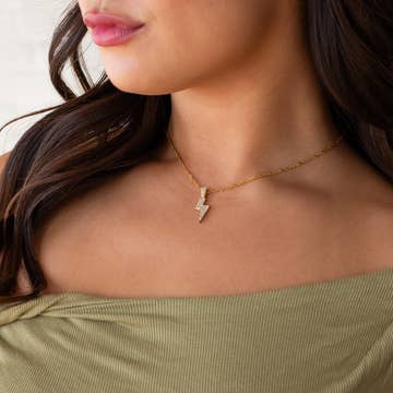 Ces éclairs avant-gardistes sont façonnés à la main et conçus avec un lustre en or 22 carats cuit au four. La chaîne est en or 14 carats. Le boulon d'éclairage mesure 1 « de long. Les bijoux Remnant Studios sont fabriqués à la main une pièce à la fois à Austin, au Texas.