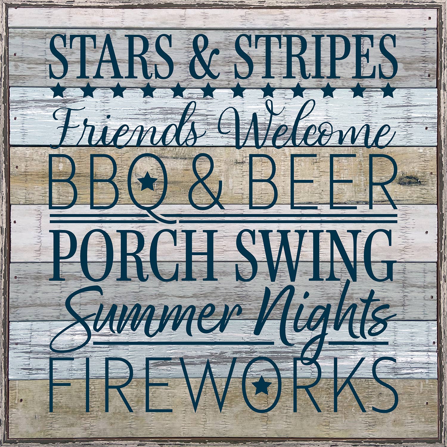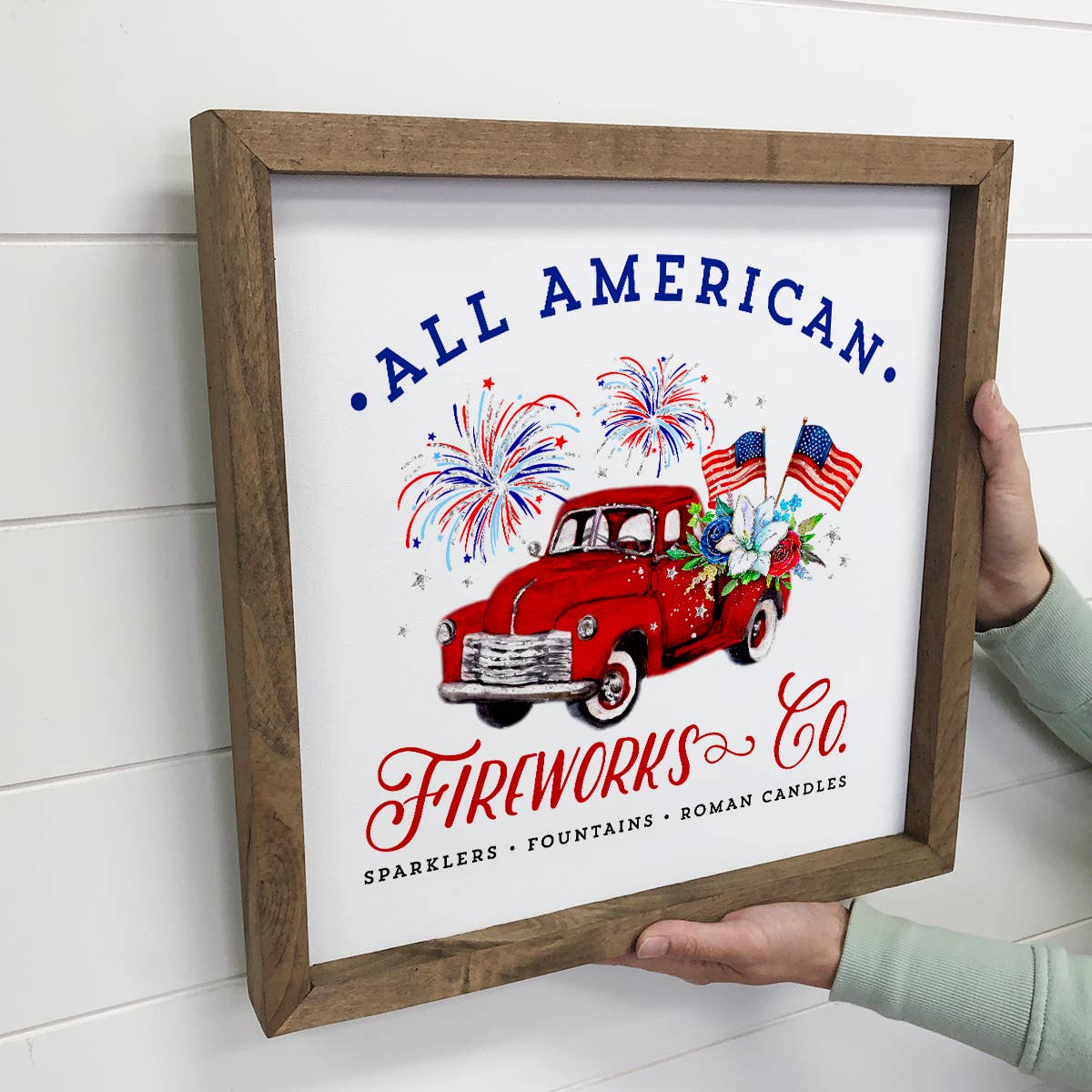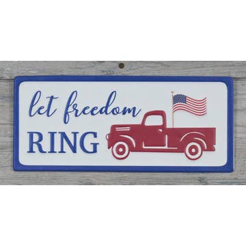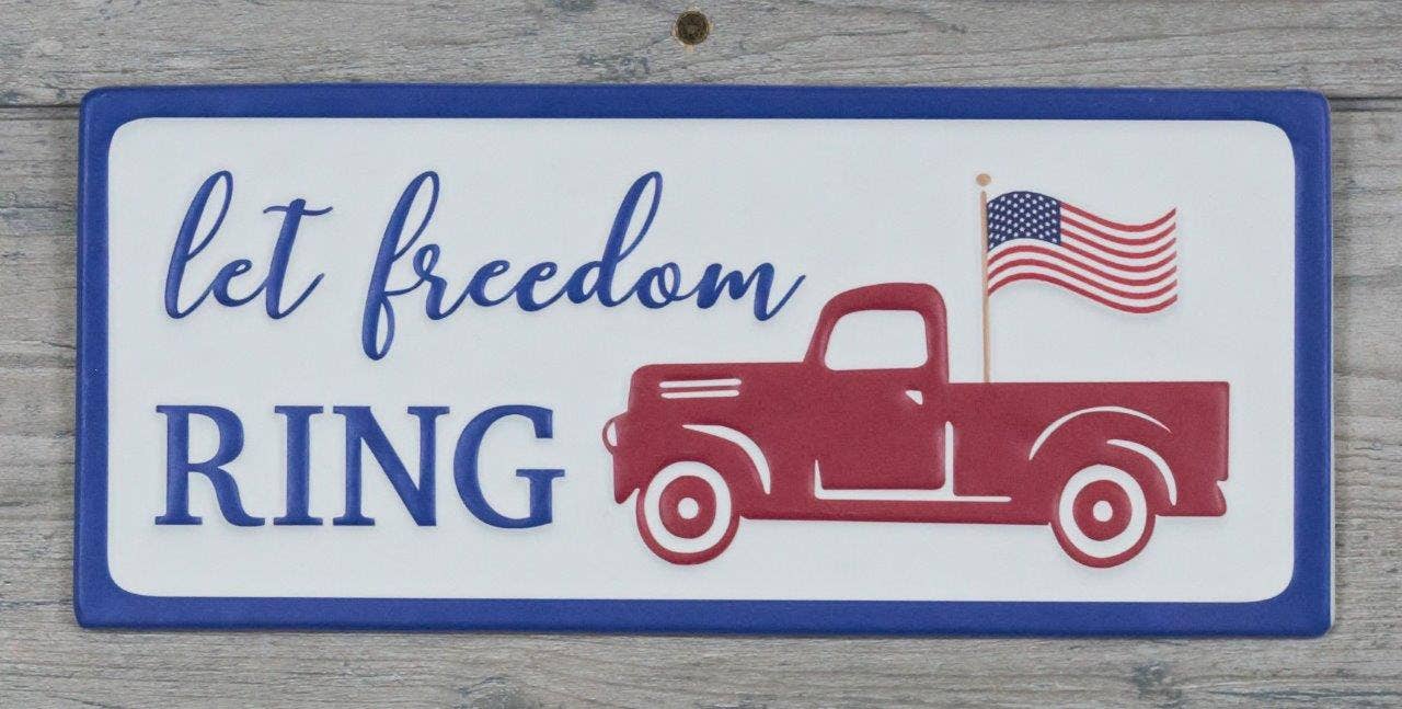 Célébrez le 4 juillet à la ferme avec le panneau métallique rustique Uncle Sam's Fireworks Truck. Cette plaque métallique de style rustique représente une camionnette rouge avec une bannière de fanions alternant le bleu avec une étoile blanche et des rayures rouges et blanches. Depuis la caisse du camion, des feux d'artifice ont éclaté en rouge, bleu et bleu clair. Une couleur bleu clair encadre le fond blanc et le tout présente de la rouille et de l'usure. Le panneau indique « Uncle Sam's Fireworks - 25¢ Sparklers - Established 1776 » dans des tons bruns. Cette enseigne est superbe accrochée aux murs et aux portes ou appuyée contre un bocal ou une boîte à lait comme pièce maîtresse pour les tables de pique-nique. Il mesure 10,5 pouces de haut, 14 pouces de large et 1,1 pouces de profondeur et possède deux crochets en D à l'arrière.