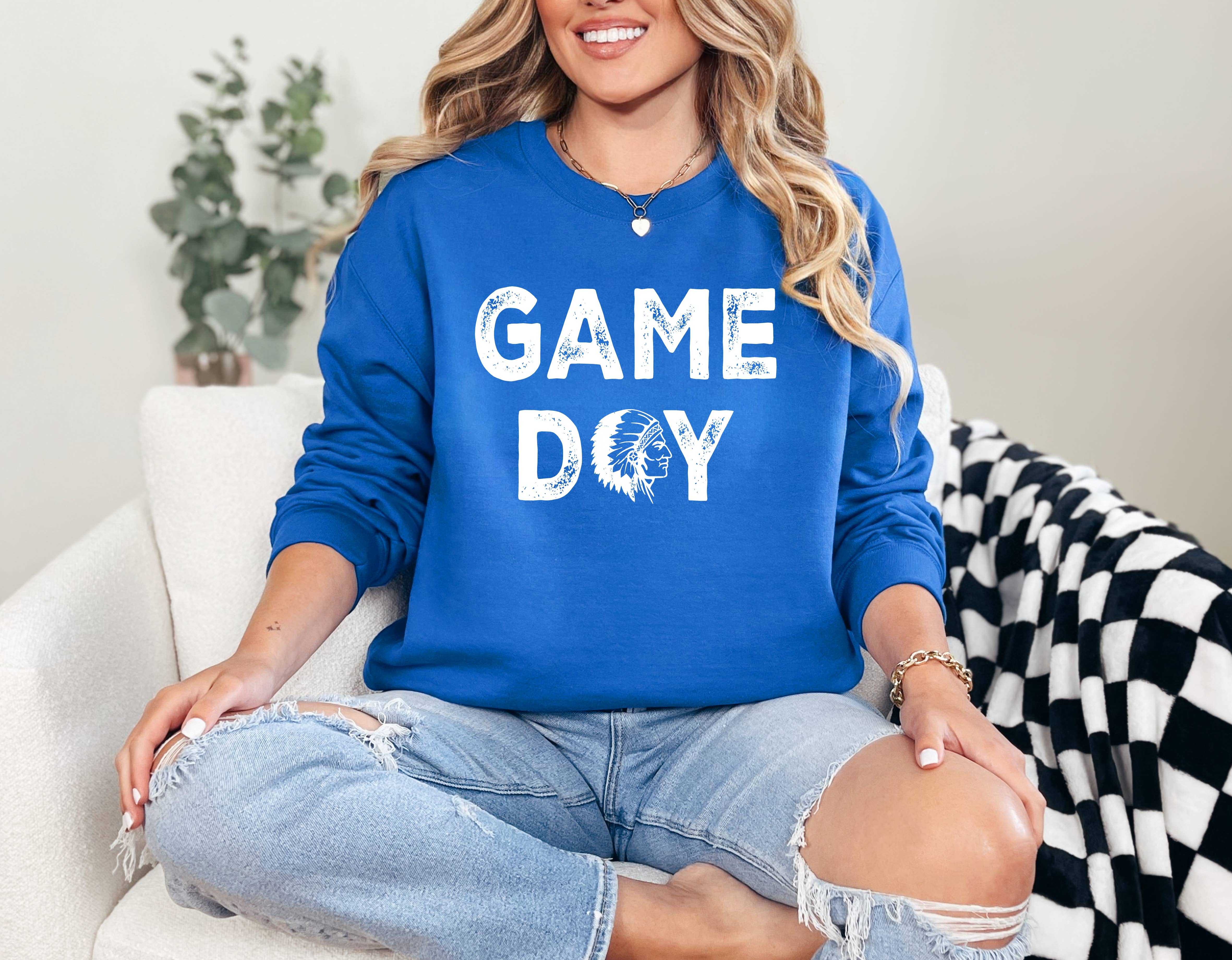 Sweat-shirt bleu Texte texturé blanc "Game Day" sur le devant 50 % polyester / 50 % coton Pré-emballage 2-2-2-2 (S-XL) Qté min. 8