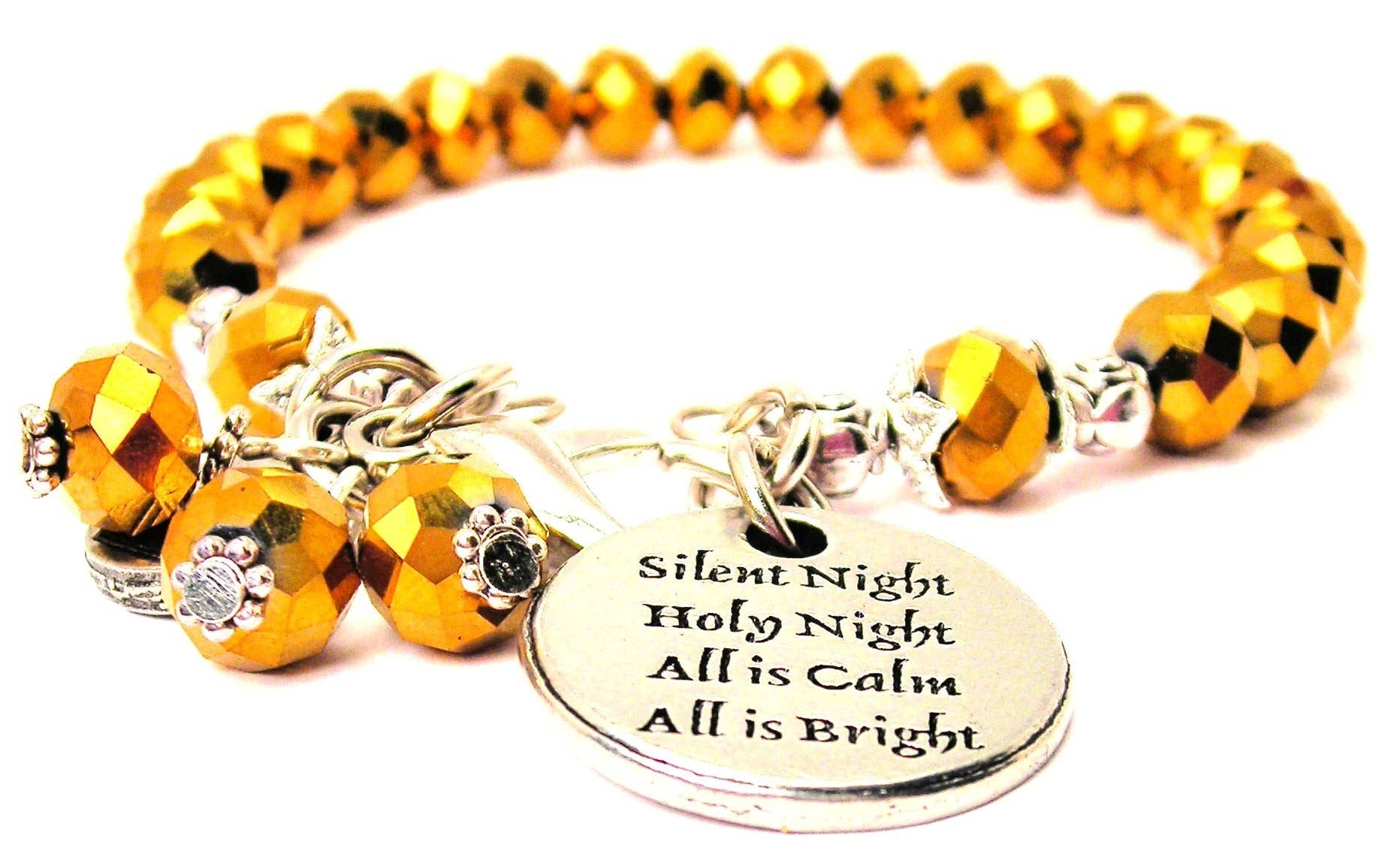 Bracelet magnétique en métal argenté de la Nativité. Des perles colorées en émail représentant la Nativité du Christ sont reliées entre elles par des maillons argentés. Le bracelet mesure 7 pouces et possède un fermoir magnétique. Emballé dans une boîte en acétate transparent de 4 1/2 pouces par 5/8 pouces par 5 3/4 pouces avec un insert qui se lit comme suit : Un couple doux et humble avait voyagé longtemps et loin jusqu'à une ville appelée Bethléem et une étable sous une étoile. Au milieu du bétail, Dieu a envoyé son fils sur terre avec seulement un chœur d'anges pour célébrer sa naissance. Pourtant, les bergers ont entendu leur message et se sont agenouillés dans la paille, émerveillés et émerveillés par le bébé qu'ils ont vu. Puis des mages sont venus adorer avec de précieux cadeaux à apporter, sachant qu'ils avaient devant eux leur sauveur et leur roi. Le Christ est venu du ciel et n'a pas compté le prix, mais derrière son humble mangeoire se tenait une croix robuste qui attendait. Verset de Lisa Engelhardt Copyright Dicksons.