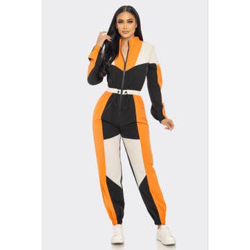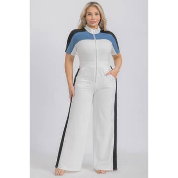Combinaison à manches courtes avec fermeture éclair à l'avant, col montant et pantalon à jambes larges. Elle présente un design en blocs de couleurs avec des poches latérales et des panneaux latéraux pour un effet amincissant.