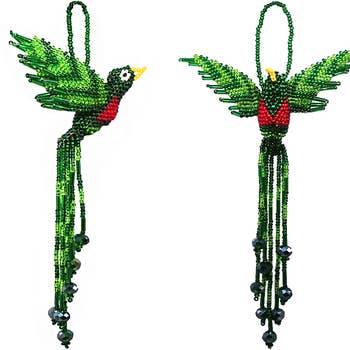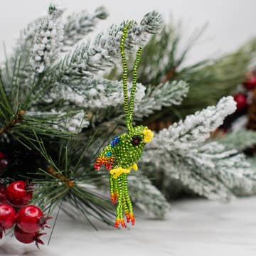 Ces décorations de Noël finement cousues à la main sont fabriquées par un artisan reconnu pour ses designs, ses techniques et son savoir-faire. Formé à la méthode de couture traditionnelle indienne Zari, il produit des broderies de la plus haute qualité qui fait la réputation de l'Inde. Travailler directement avec l'artisan depuis 2005 a permis de développer une relation commerciale qui intègre toutes les valeurs du commerce équitable qui sont importantes pour le soutien et la pérennité de l'artisanat artisanal. L'achat de ces décorations permet de soutenir directement un artisan qui se consacre à son métier et qui est très fier de son travail. Les motifs d'ornement incluent : des étoiles, des cœurs, des lunes et des arbres de Noël inspirés de la nature Perroquet de -5,5 pouces -Fabriqué à la main -Négocié de manière équitable -Fabriqué en Inde