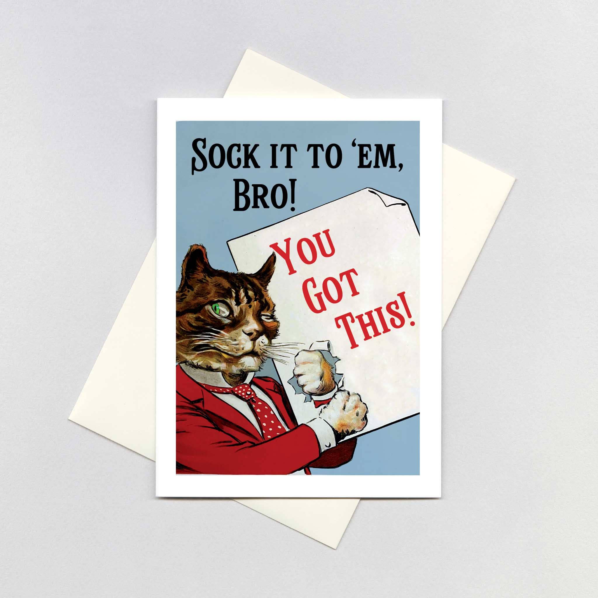 Un chat ébloui classique à peine accroché... un rappel pour tenir bon ! Imprimé en bleu fédéral et en or métallisé. - Carte A2 pliée, intérieur vierge - Enveloppe blanche - Encre écologique à base végétale - Imprimé sur du papier cartonné en fibre de verre 100 % recyclé et certifié FSC - Pochette compostable dans le commerce