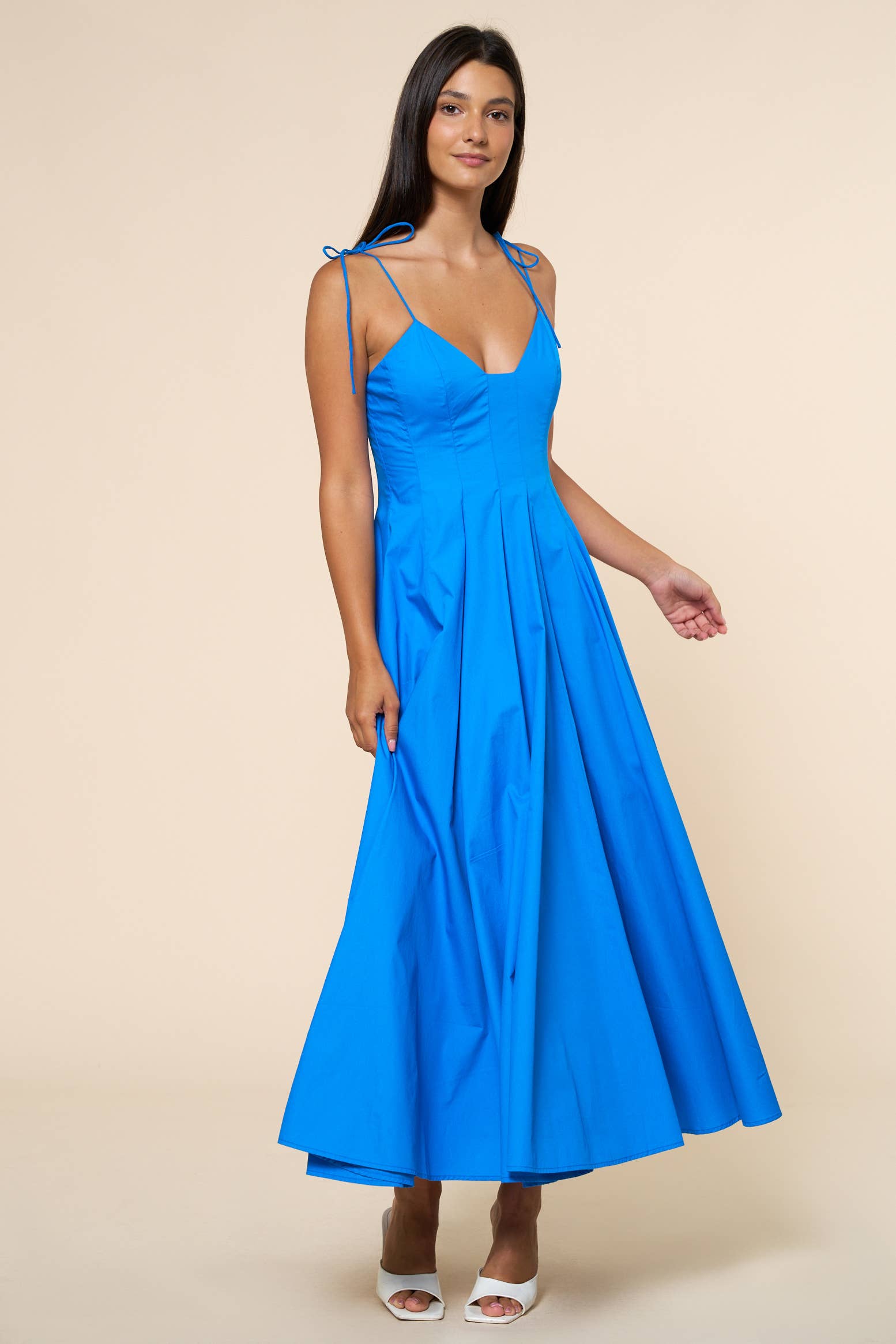 Robe longue à plis mixtes en popeline de coton mélangé. Ce modèle sans manches comprend une jupe midi à plusieurs niveaux avec une alternance de couches plissées et plates, un corsage ajusté, des bretelles réglables et une fermeture à glissière cachée au dos.