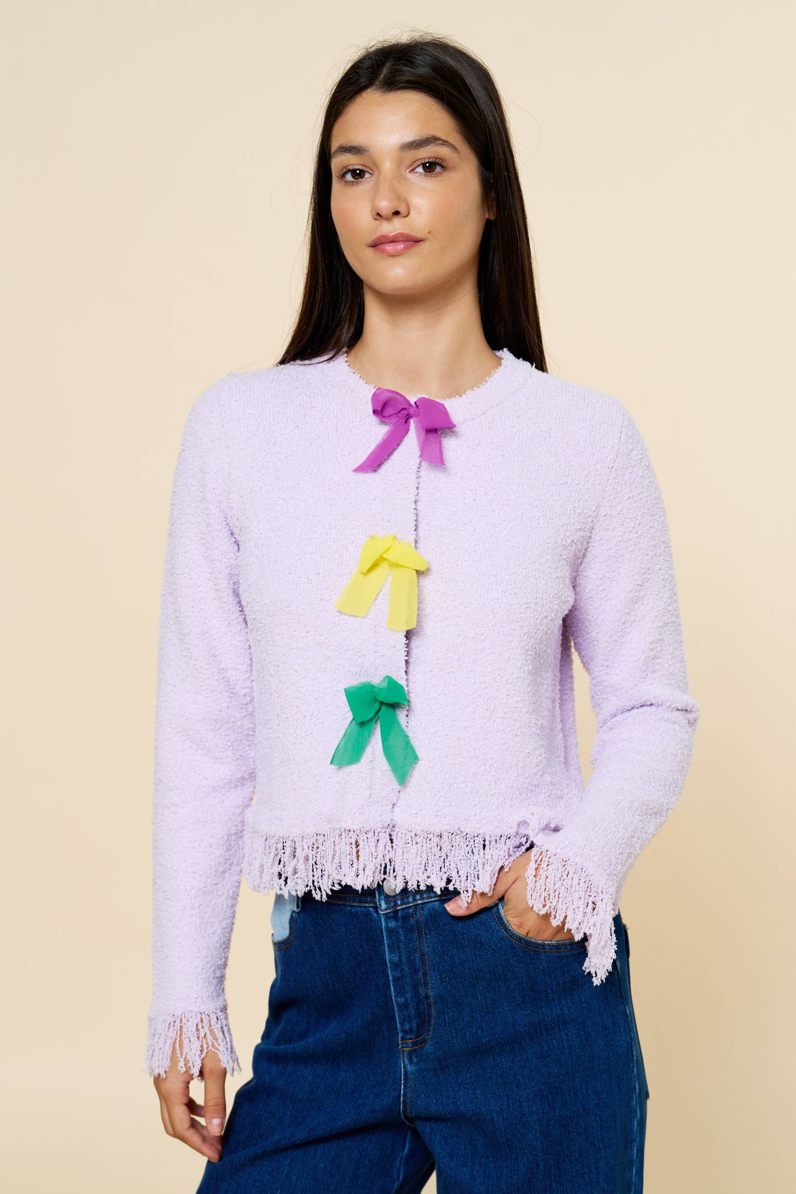 Cardigan à effet illusion avec devant ouvert en tissu tulle. Ce cardigan présente des volants froncés volumineux superposés et une finition à volants autour du col. Il est doté de manches longues et d’une fermeture par un bouton unique au niveau du col, le devant restant ouvert. # barbie # barbiecore