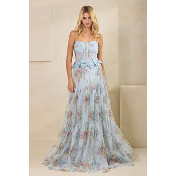 Robe longue à imprimé floral bleu satiné à col en V XH5004 en vente B2B