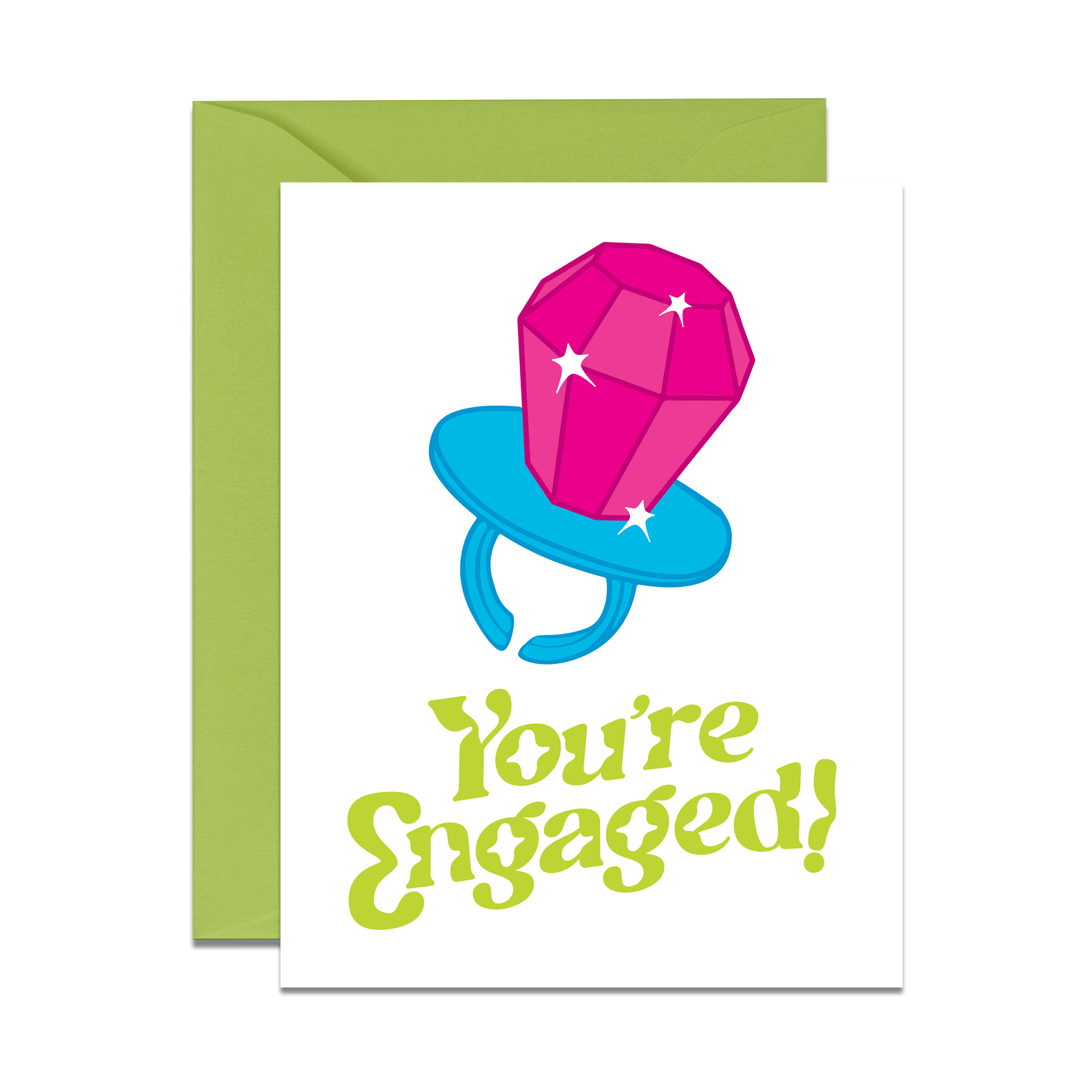 « Vous êtes fiancés ! ». Une jolie carte de fiançailles avec un hamster illustré à la main tenant une grande bague en diamant brillant. - Format A2 (4.25" x 5.5"), intérieur vierge -120 lb de papier certifié FSC -Carte unique et enveloppe scellée dans un sac de violoncelle transparent ou un emballage sans plastique -Fait à la main par l'artiste à Berkeley, Californie, États-Unis