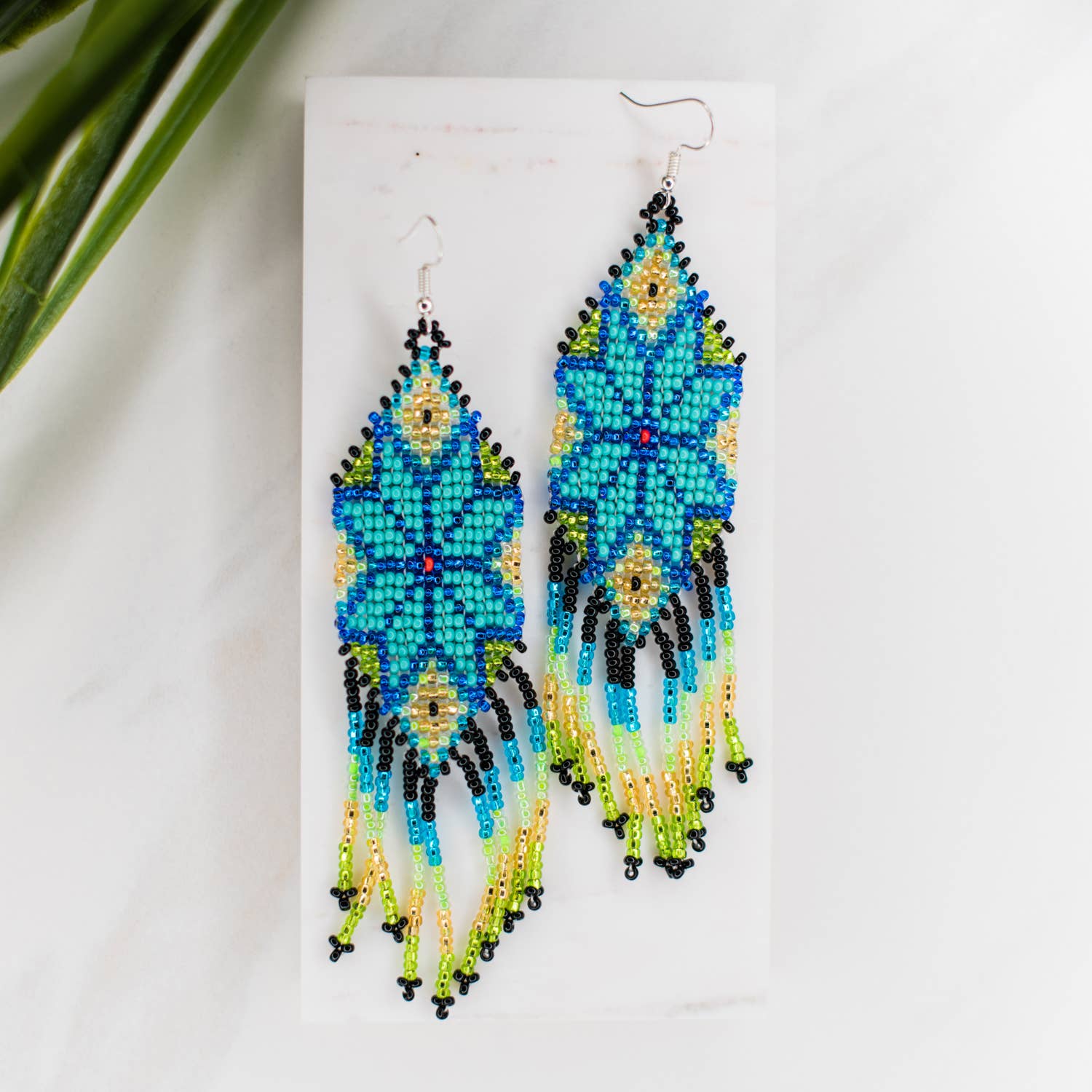 Inspirées par les tissus Huipil tissés de manière complexe du Guatemala, ces boucles d’oreilles à franges imposantes associent une partie supérieure monochrome tissée avec des perles très réfléchissantes à une magnifique cascade de franges colorées. Les franges comportent des motifs géométriques et floraux, rappelant les symboles traditionnels des Huipiles. La partie perlée est suspendue à une tige boule en acier inoxydable. Ces boucles d’oreilles sont tissées à la main par des femmes artisanes issues de communautés vulnérables de Medellín, en Colombie, qui bénéficient de conditions de travail équitables et d’une rémunération juste pour leur savoir-faire. Matériaux : - Perles de verre Miyuki - Fil de nylon - Tige en acier inoxydable Dimensions : - Longueur : 9,5 cm (3,75 pouces) - Largeur : 3,2 cm (1,25 pouce) *Ces boucles d’oreilles sont disponibles en plusieurs coloris. **Les dernières photos montrent nos cartes de présentation et le merchandising en magasin.