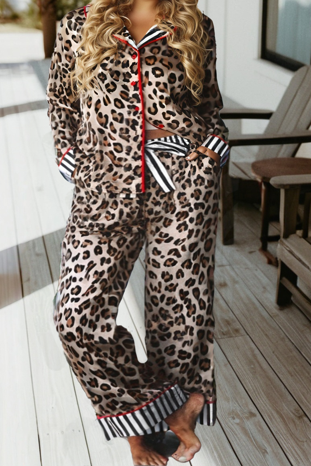 Ensemble de pyjama chemise et pantalon à bordure rayée léopard LAS (S-4X)