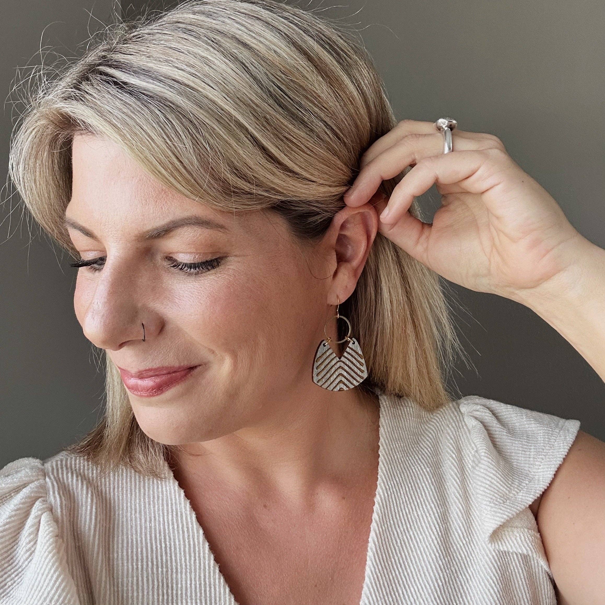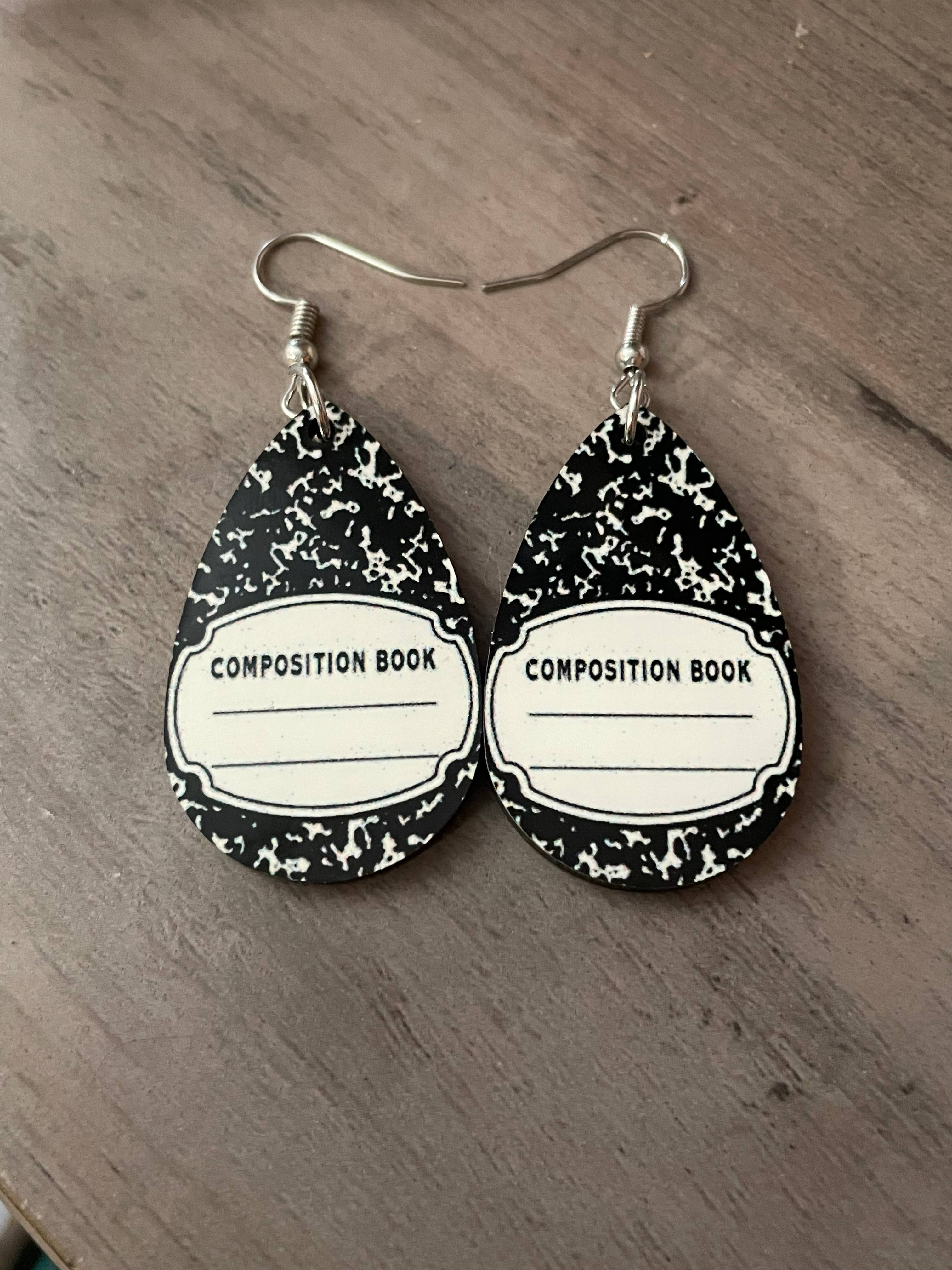 Belles boucles d'oreilles fantaisistes en bois blanc délavé ornées de notes de musique argentées en relief.