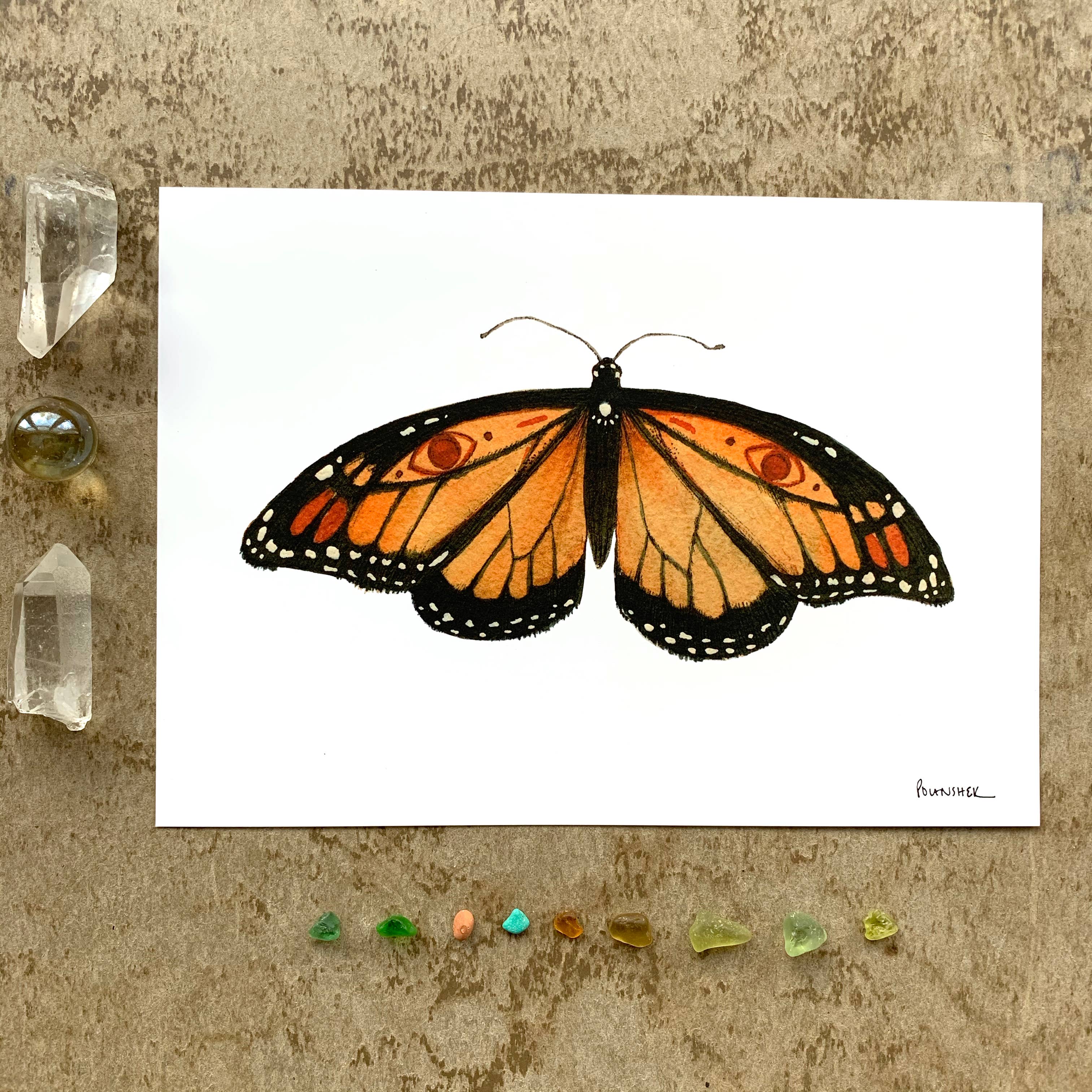 Une estampe d'art présentant une illustration originale peinte par l'artiste Stephanie Hathaway. Il est imprimé sur un beau papier aquarelle texturé blanc cassé afin que les impressions aient l'aspect et le toucher d'une peinture originale. Les tirages d'art sont emballés avec amour dans une pochette en cellophane biodégradable. Cette estampe présente des illustrations de la métamorphose du papillon monarque adoré.