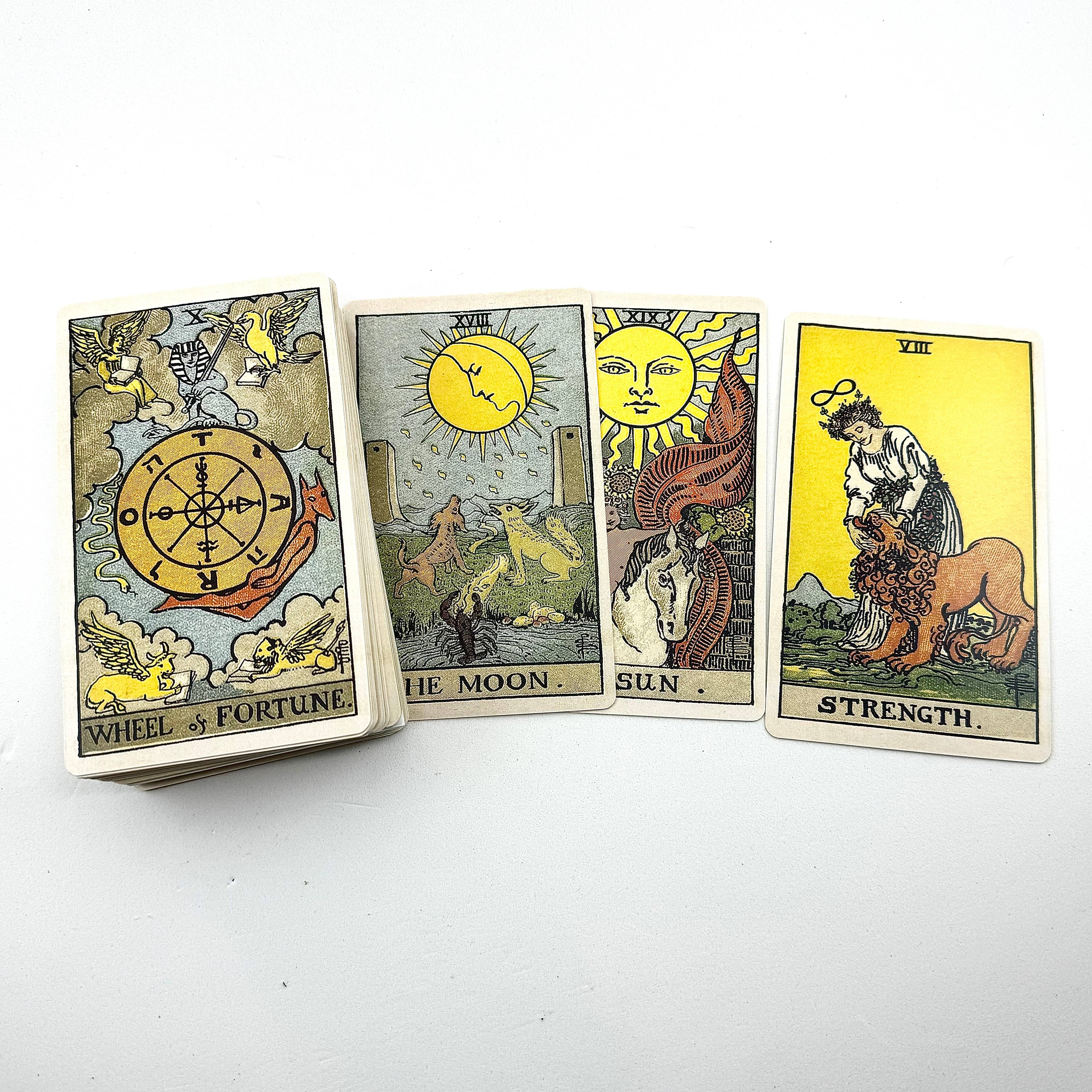 Nos jeux de tarot sont parfaits pour les débutants ! Même une personne qui n'a jamais lu le tarot peut commencer à faire des tirages immédiatement, sans expérience préalable et sans avoir besoin de chercher les significations dans des livres ou sur internet. Même les lecteurs expérimentés apprécient la commodité d'avoir les mots-clés directement sur ces cartes ingénieuses. ✦ 70 x 120 mm (environ 2,75 x 4,75 pouces) ✦ Finition mate ✦ 78 cartes comprenant tous les Arcana majeurs et mineurs ✦ Illustrations traditionnelles Rider-Waite ✦ Mots-clés pour les significations droites et inversées imprimés sur chaque carte ✦ Aucun guide nécessaire !