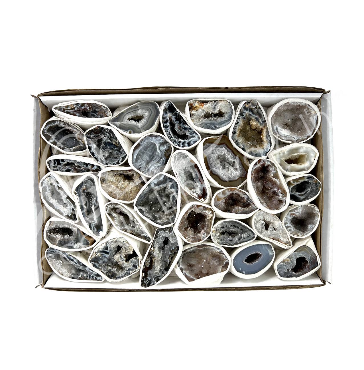 Un assortiment de grappes de géodes d'agate provenant du Brésil, vendues dans une boîte. Chaque boîte contient environ 10 à 20 pièces.