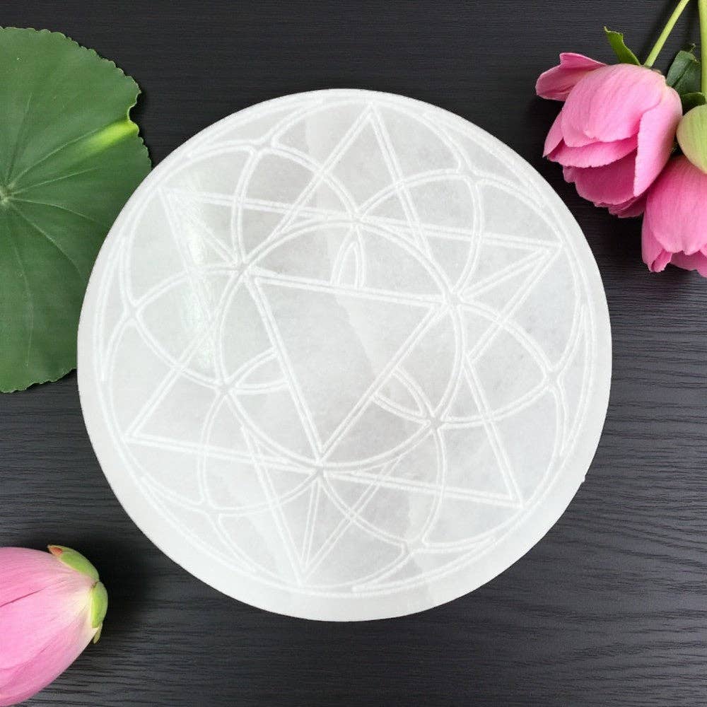 Dessous de verre de chargement en sélénite - Fleur de Vie, 3 3/4" D Min. 3