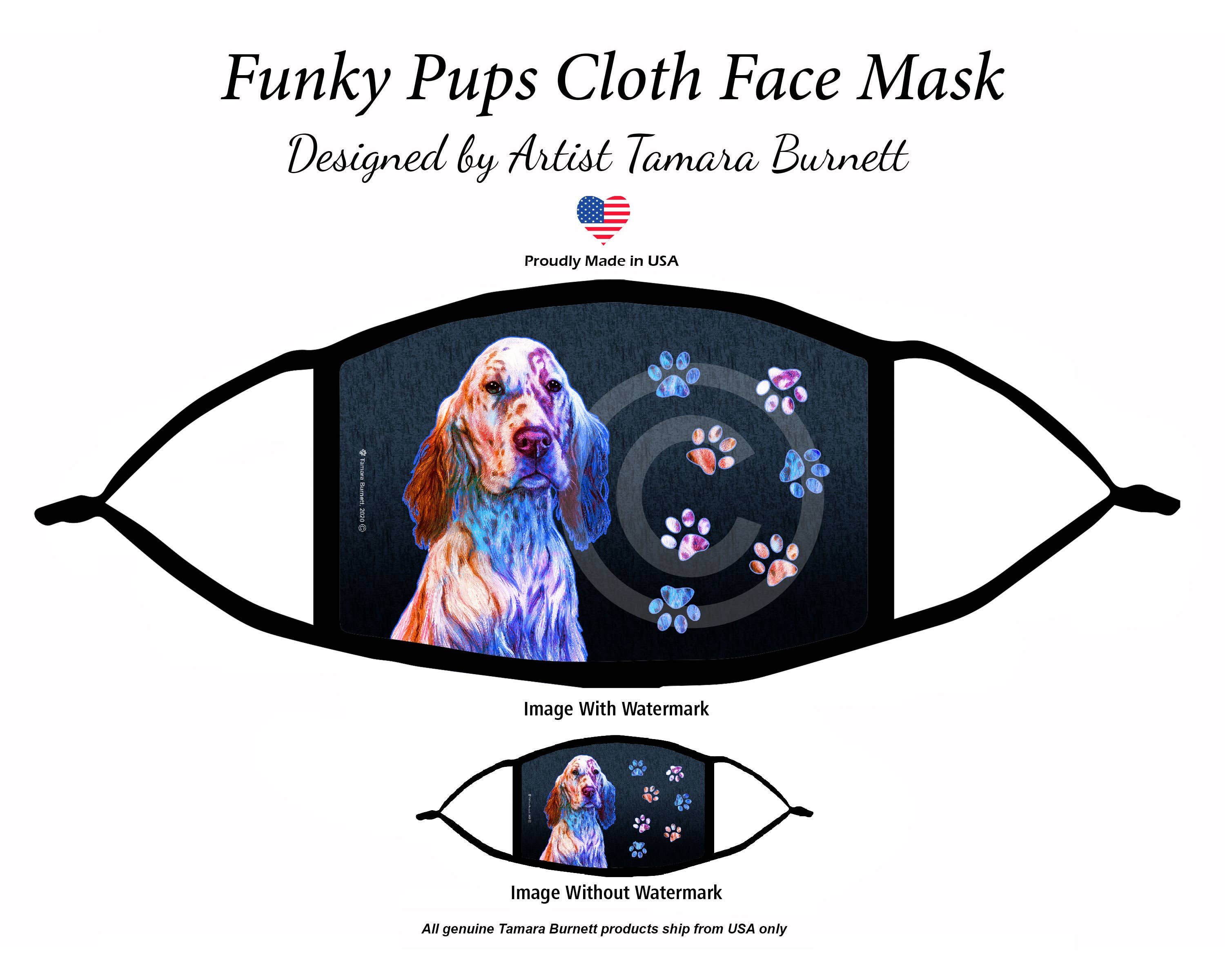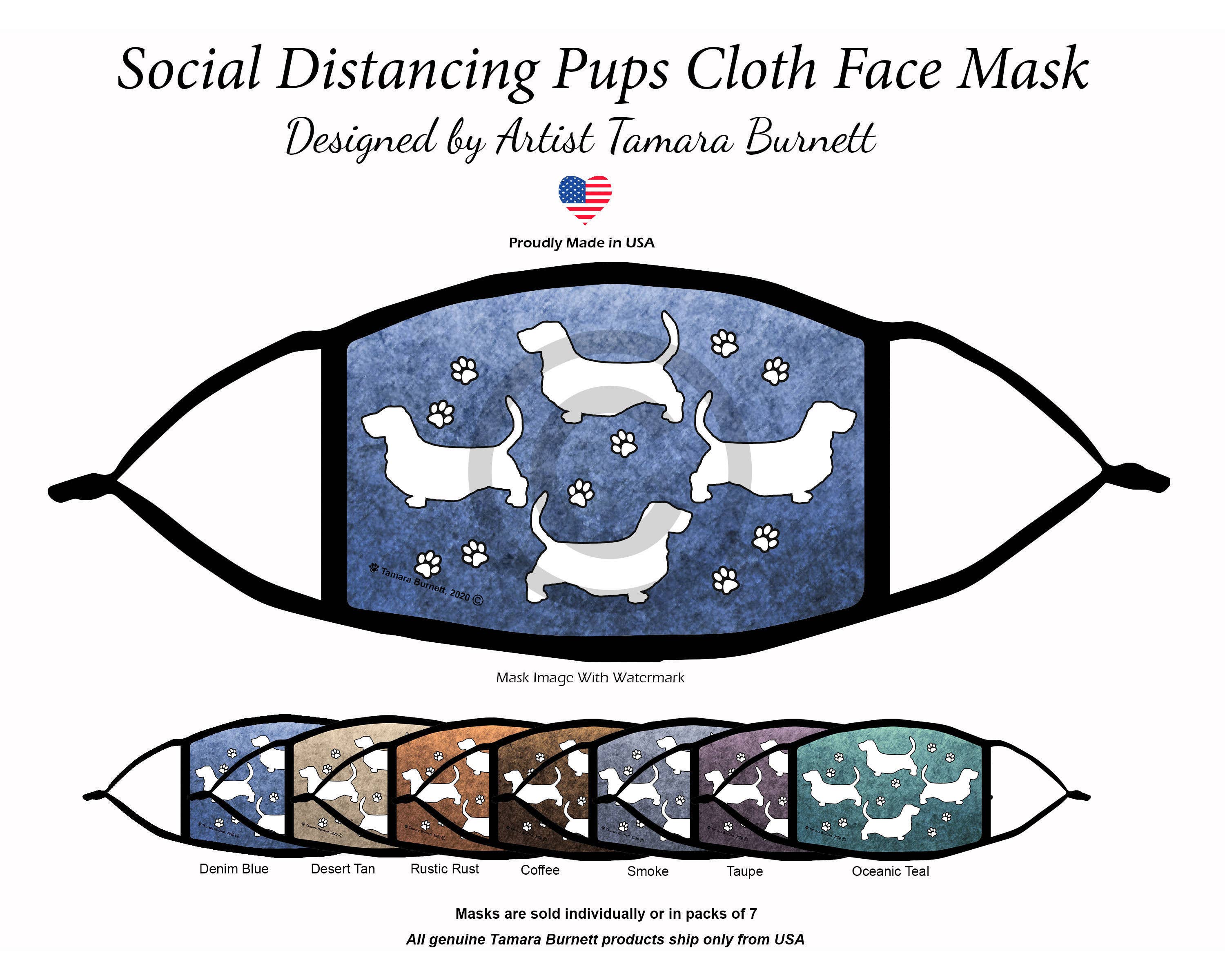 Masque facial pour les amateurs de chiens fièrement fabriqué aux États-Unis et orné d'œuvres d'art de l'artiste renommée Tamara Burnett. Ce masque est fabriqué avec 3 couches de 100 % polyester de haute qualité. Dimensions de la taille du masque — 7,5 po l. x 4,5 po h. Masques faciaux avec une couverture du visage plus grande coupe super confortable et facile à porter. Lavable et réutilisable ! Réglage de la longueur, des perles en caoutchouc sont disponibles pour les visages adultes plus petits. Ce sont des masques non médicaux. N'incluez pas de filtres.