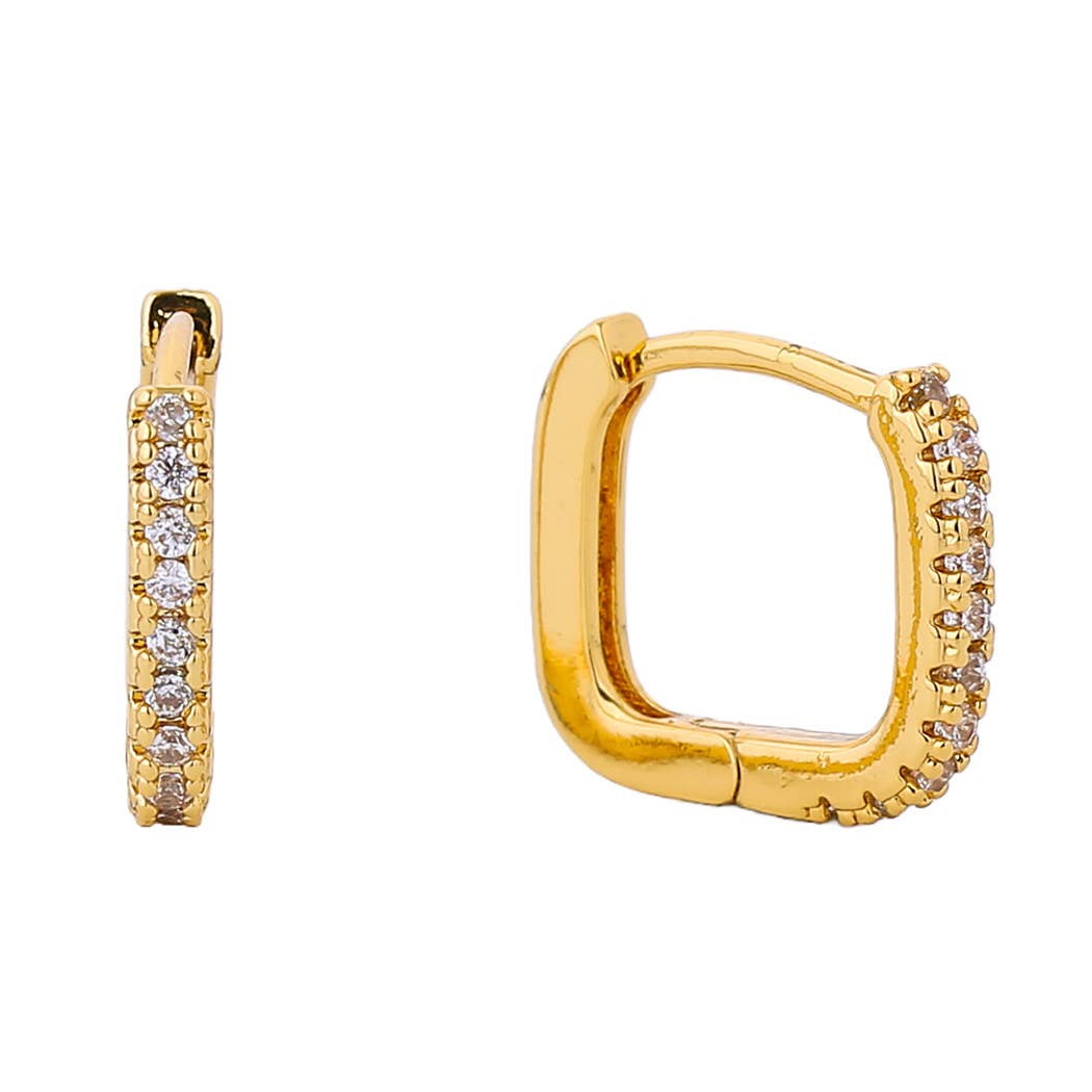 Petit cerceau carré orné de CZ brillants. Cliquez facilement pour ouvrir et fermer. Dimensions : environ 0,75 pouces x 0,75 pouces Laiton plaqué or 18 carats, oxyde de zirconium cubique Sans plomb ni nickel