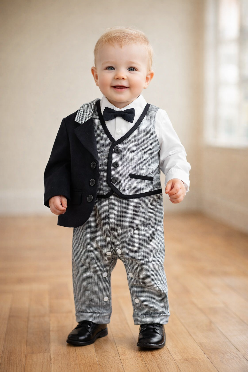 Cet ensemble comprend une chemise boutonnée à manches courtes ornée d'étoiles imprimées sur toute la surface, un pantalon noir à bretelles et un nœud papillon bleu pour compléter cet adorable ensemble. La fermeture boutonnée sur le devant du pantalon, ainsi que l'élastique arrière et les bretelles rayées, garantissent un ajustement élastique et sûr. Il peut être porté en ensemble ou mélangé à d'autres articles pour un look délicieusement mignon. Taille : 6-12 mois 2-3T Matériau : coton Entretien : lavage en machine
