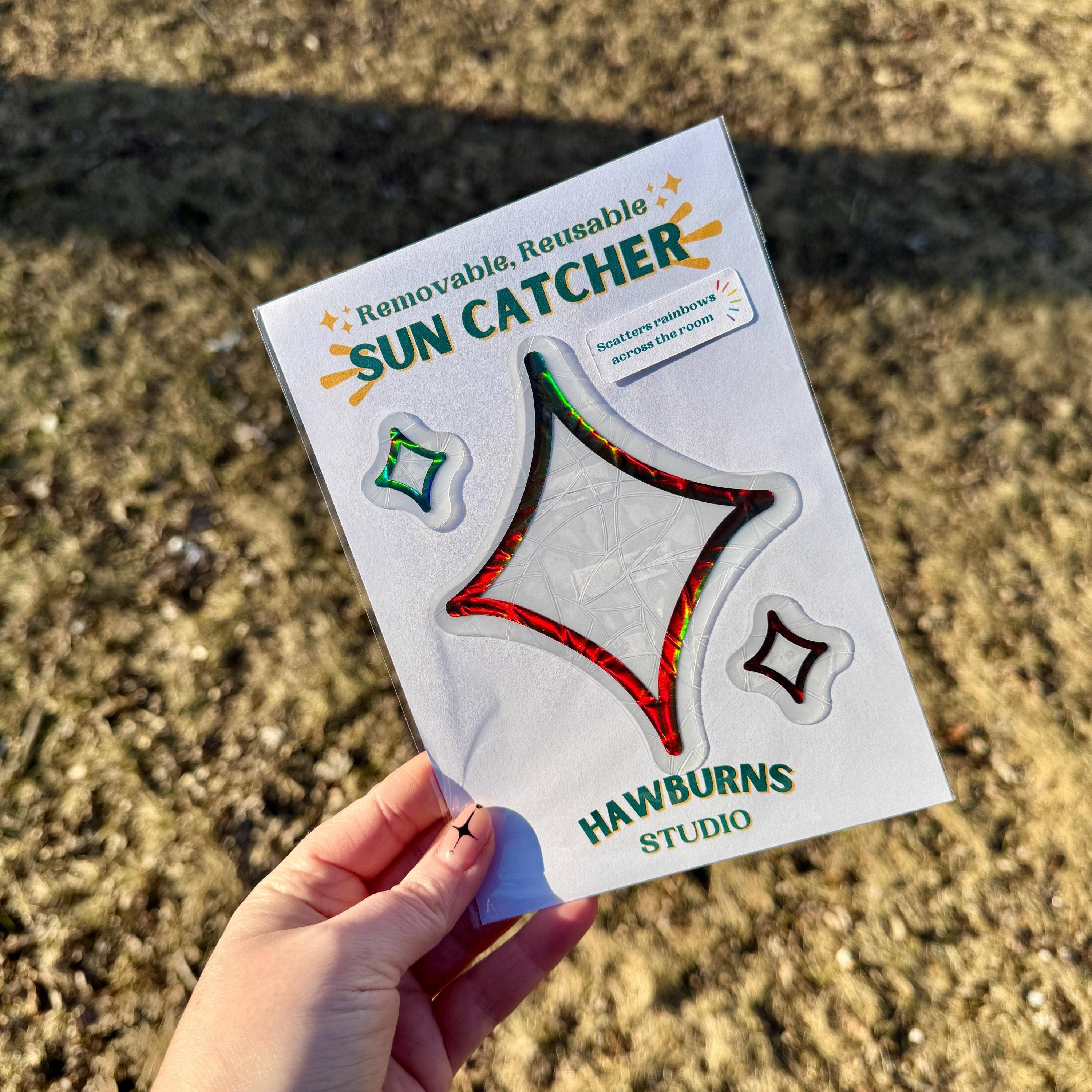 Ajoutez un peu de magie arc-en-ciel à votre vie ! Mes attrape-soleil sont fabriqués à partir de films adhésifs prismatiques superposés avec du vinyle holographique noir. Cela les rend résistants aux intempéries, étanches et durables. L'attrape-soleil diffusera des arcs-en-ciel dans toute votre pièce lorsque la lumière directe du soleil le touchera (voir les photos incluses !). Mes attrape-soleil sont simples à appliquer, amovibles/réutilisables et ne laissent aucun résidu lorsqu'ils sont retirés. Les attrape-soleil utilisent l'adhérence statique et l'humidité pour adhérer à une fenêtre ou toute surface plane semblable à une fenêtre. Cet attrape-soleil mesure 4,9 pouces par 3,5 pouces. Instructions : - Trouvez une fenêtre ensoleillée propre - Humidifiez la surface avec un vaporisateur ou un chiffon humide - Retirez le film protecteur - Appliquez sur la fenêtre - Utilisez votre main ou une carte pour aplatir - Laissez sécher et profitez :)