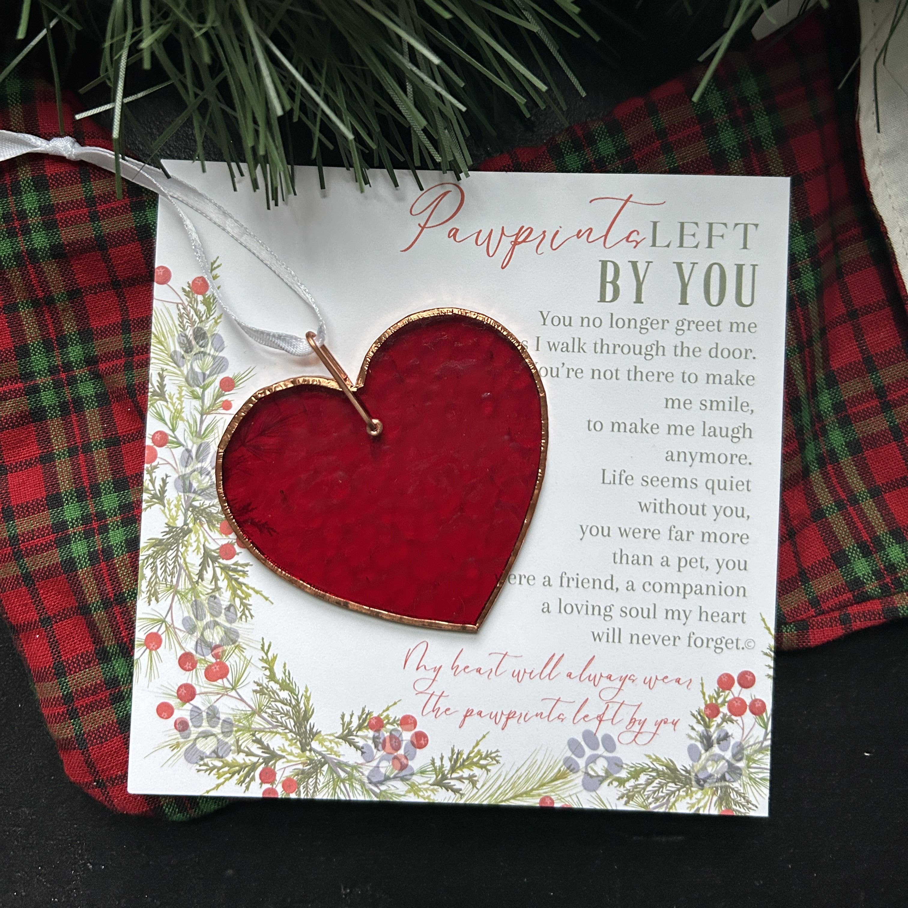 Honorez l'amour qui ne s'efface jamais avec Pawprint Memories. Cette belle étoile en verre teinté iridescent de 4" scintille avec une lumière changeante, symbolisant l'impact durable d'un animal de compagnie bien-aimé. Cadeau attentionné pour la perte d'un chat ou d'un chien. Le verre de l'étoile change de couleur en fonction de la lumière et des arrière-plans, intéressant et beau, l'étoile peut être suspendue par le ruban de satin noir attaché ou placée n'importe où et offerte à tout moment de l'année. Le message est imprimé sur du papier cartonné épais et les deux sont présentés dans une boîte en lin noir de 5,25" x 7,25" avec un couvercle transparent. Les composants du produit sont fabriqués aux États-Unis ; chaque étoile est fabriquée à la main aux États-Unis et au Mexique.