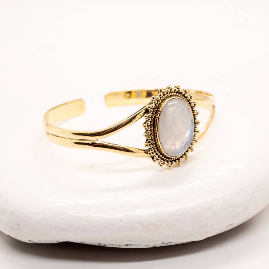 Pierre : pierre de lune. Métal : laiton et argent sterling. Une combinaison véritablement magique, notre bracelet de renaissance combine la puissance du labradorite et de la pierre de lune. Honorant le cycle sacré de la vie, de la mort et de la renaissance, ce bracelet époustouflant émule les enseignements anciens et le timing divin. Sculpté à la main, et 100% unique en son genre. Taille : ajustable, taille unique.