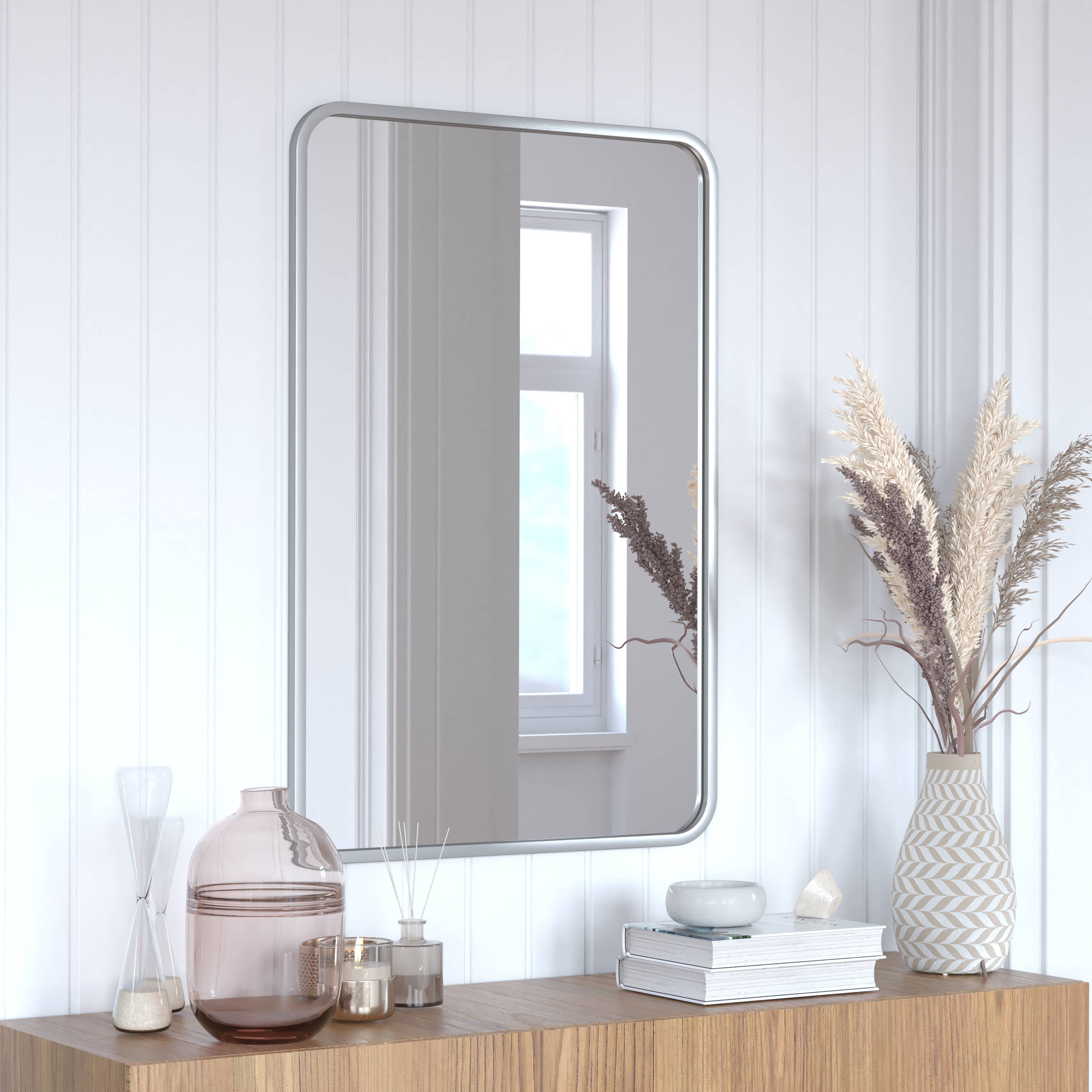 Miroir mural décoratif Janinne de 20 po x 30 po - Coins arrondis, miroir en verre pour salle de bain et salon à suspendre à l'horizontale ou à la verticale, décoration printanière noire mate, décoration automnale.