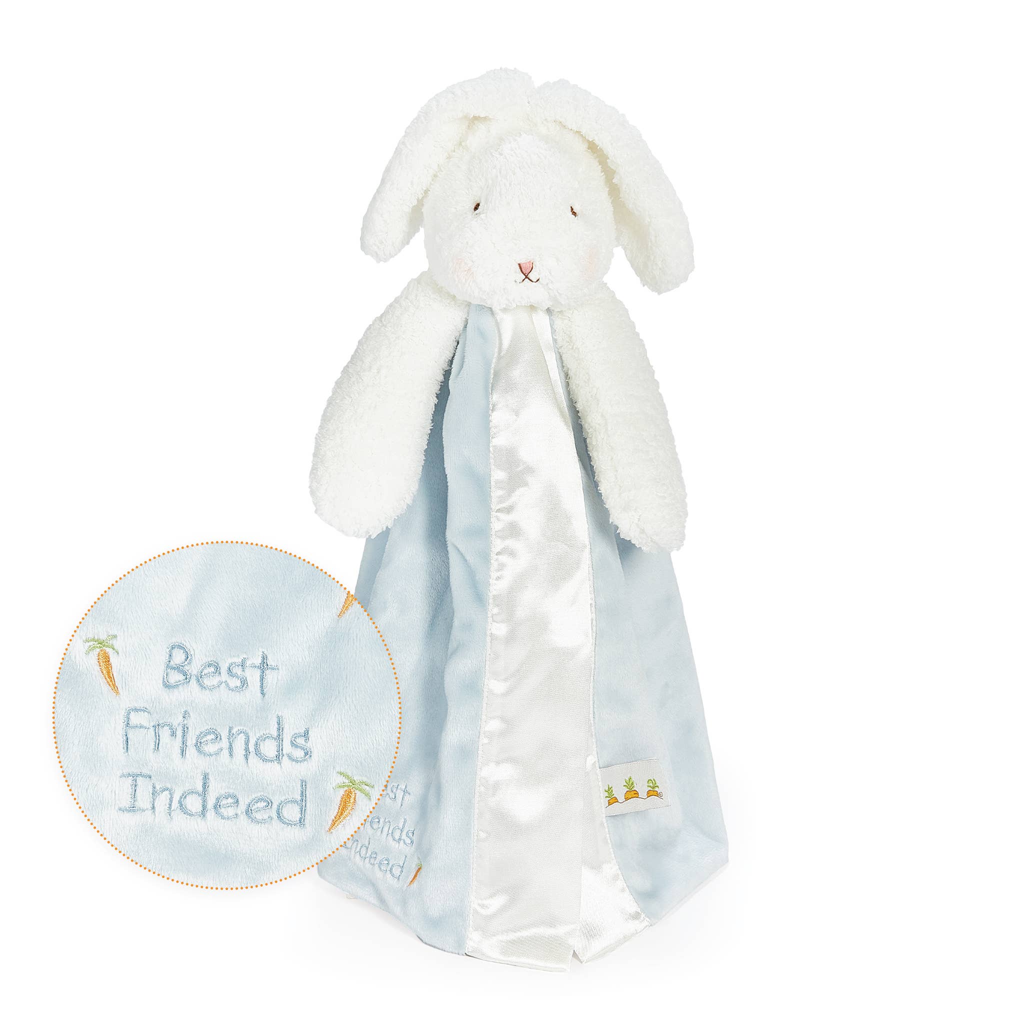 Caractéristiques Longueur de 16" facile à câliner, avec doublure en satin Détails brodés Sûr pour bébé 100 % polyester Lavage en machine et séchage à basse température Cette couverture de sécurité préférée est à la fois un animal en peluche et un doudou ! Le meilleur des deux, pour réconforter et apaiser même les bébés les plus exigeants. Bloom a une tête et des bras d'animal en peluche de lapin blanc aux oreilles tombantes avec un visage brodé à la main, sûr pour bébé. La couverture fendue en velours gris glacier, douce et moelleuse, est doublée et bordée de satin soyeux pour le développement tactile et l'apaisement, et conçue en tenant compte de la sécurité. Elle est sûre de devenir une meilleure amie pour votre petit, la différence réside dans les détails. Du message brodé le long du bord de la couverture qui dit "Meilleurs amis pour de bon" avec une charmante petite abeille et sa traînée bourdonnante, à l'étiquette signature à trois carottes que chaque bébé explorera sans aucun doute avec ses petits doigts, nos couvertures de sécurité sont un confort indispensable pour bébé.